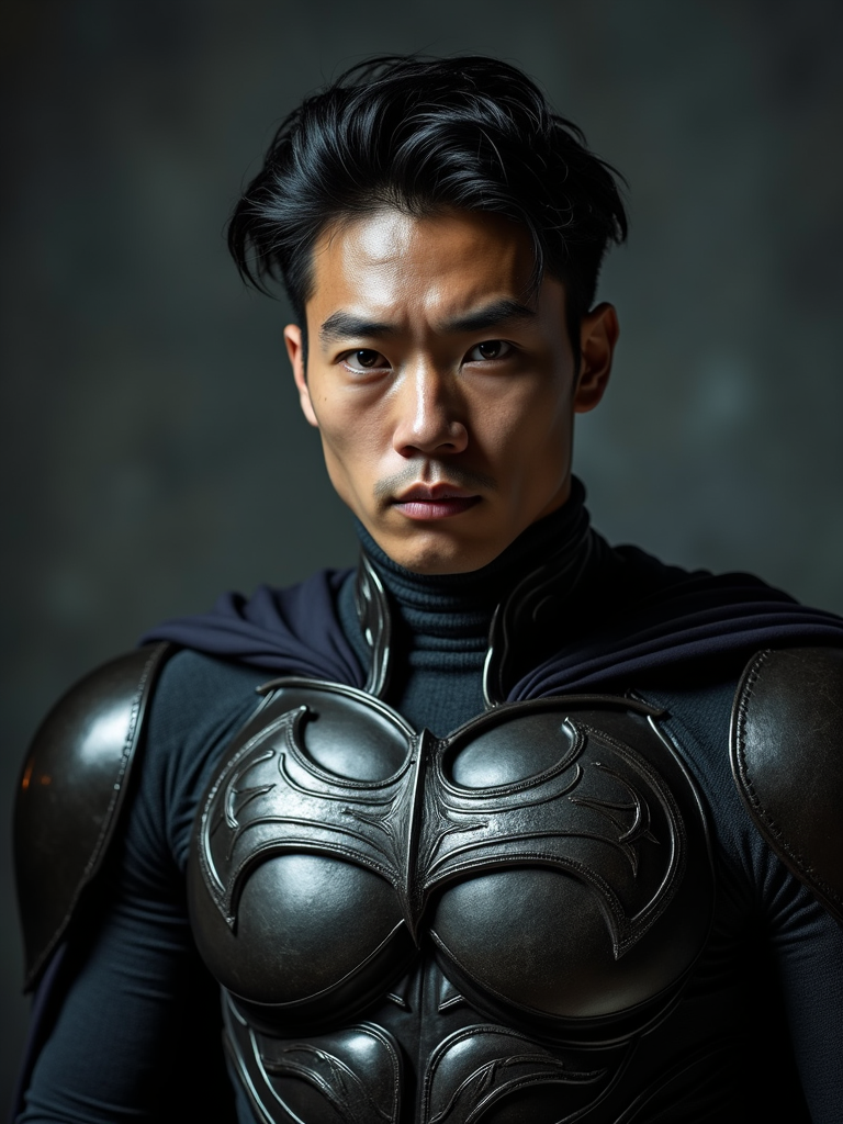 model at a cosplay photo booth, wearing a dark knight costume with metallic glossy armor, soft focus background, emphasizing character detail