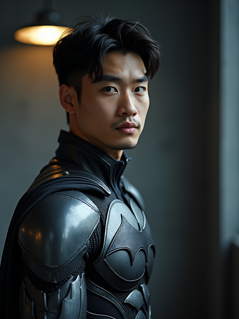 model at a cosplay photo booth, wearing a dark knight costume with metallic glossy armor, soft focus background, emphasizing character detail
