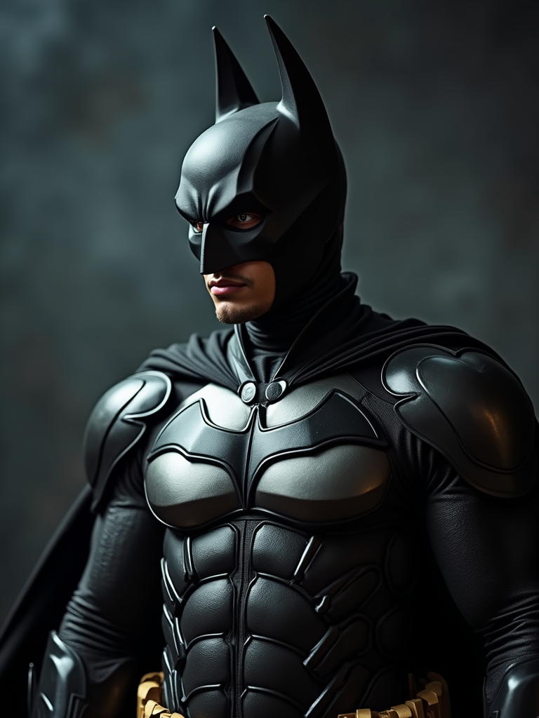 model at a cosplay photo booth, wearing a dark knight costume with metallic glossy armor, soft focus background, emphasizing character detail