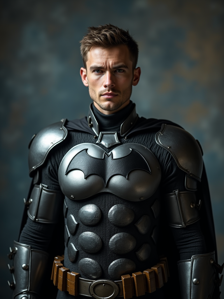 model at a cosplay photo booth, wearing a dark knight costume with metallic glossy armor, soft focus background, emphasizing character detail