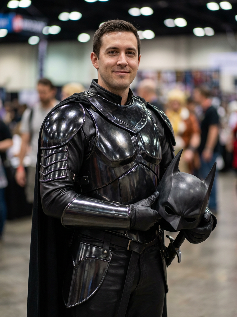 model at a cosplay photo booth, wearing a dark knight costume with metallic glossy armor, soft focus background, emphasizing character detail