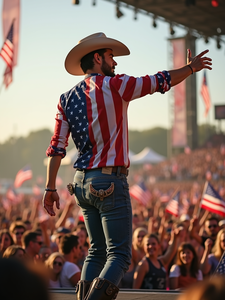 model at a country music festival, wearing a stars and stripes shirt, blue jeans, and cowboy boots with eagle spurs, American flag cowboy hat, surrounded by cheering crowds waving small flags, stage decorated with patriotic bunting