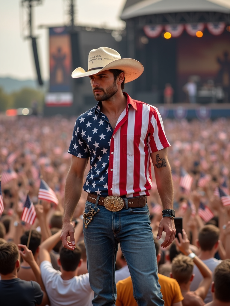 model at a country music festival, wearing a stars and stripes shirt, blue jeans, and cowboy boots with eagle spurs, American flag cowboy hat, surrounded by cheering crowds waving small flags, stage decorated with patriotic bunting
