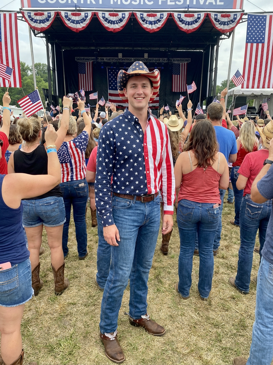 model at a country music festival, wearing a stars and stripes shirt, blue jeans, and cowboy boots with eagle spurs, American flag cowboy hat, surrounded by cheering crowds waving small flags, stage decorated with patriotic bunting
