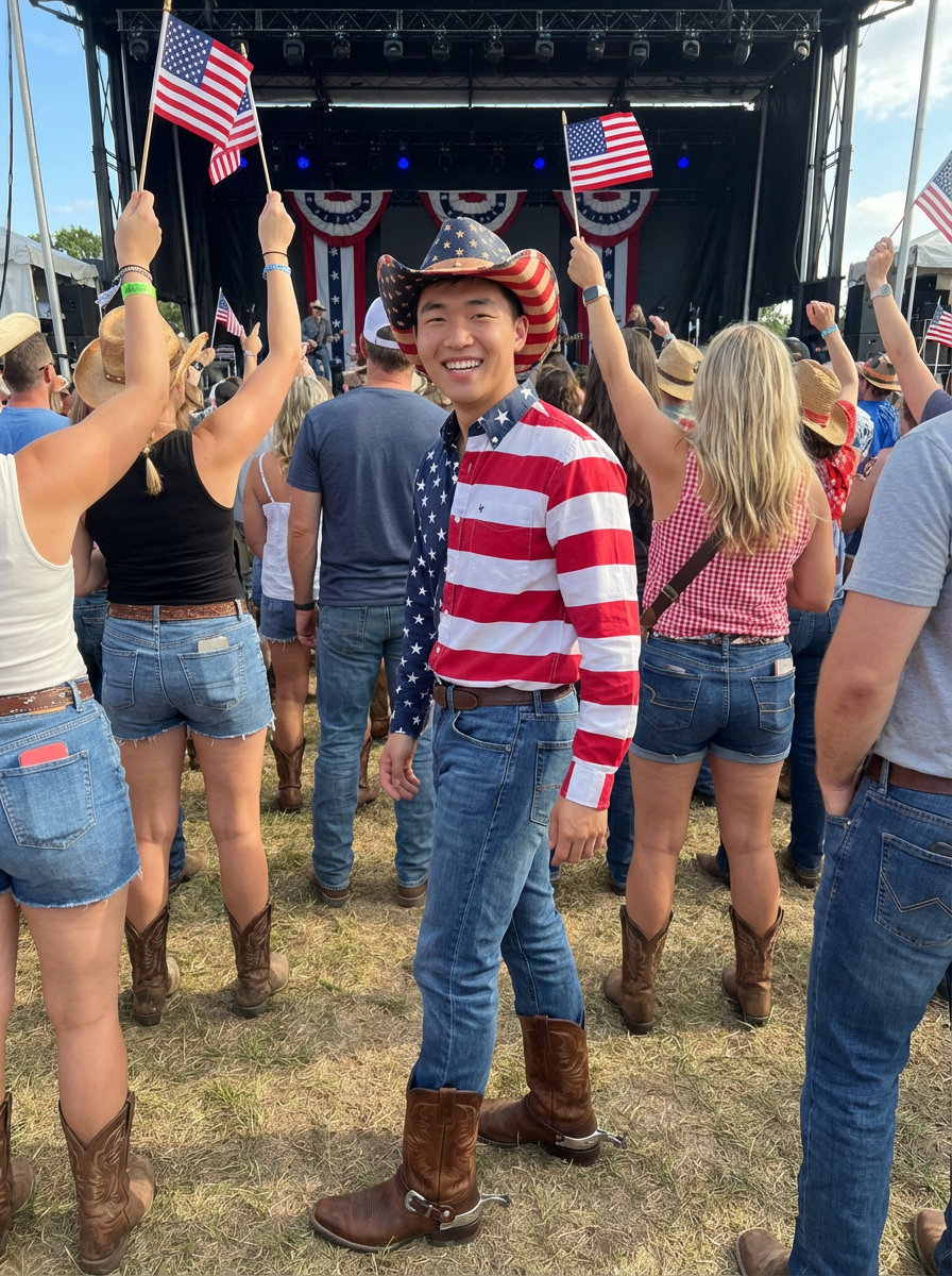 model at a country music festival, wearing a stars and stripes shirt, blue jeans, and cowboy boots with eagle spurs, American flag cowboy hat, surrounded by cheering crowds waving small flags, stage decorated with patriotic bunting