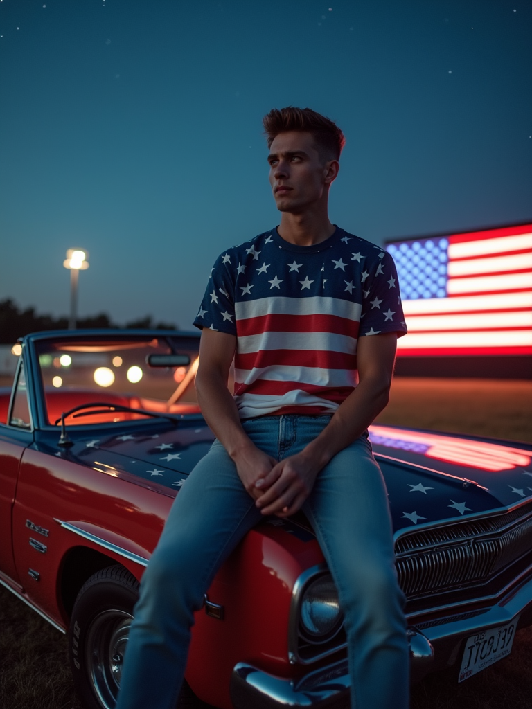 model at a drive-in movie theater showing a patriotic film, sitting on the hood of a classic American-made car decorated with flag decals, wearing jeans and a patriotic t-shirt, under a starry night sky, surrounded by American flags