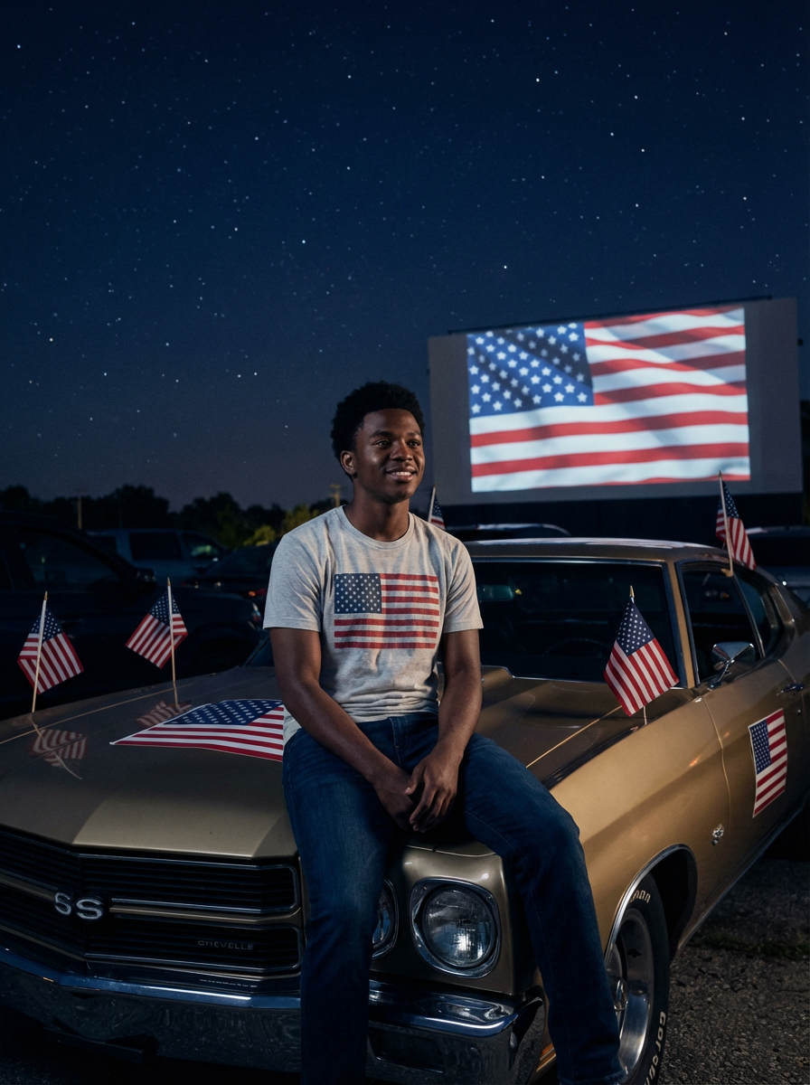 model at a drive-in movie theater showing a patriotic film, sitting on the hood of a classic American-made car decorated with flag decals, wearing jeans and a patriotic t-shirt, under a starry night sky, surrounded by American flags