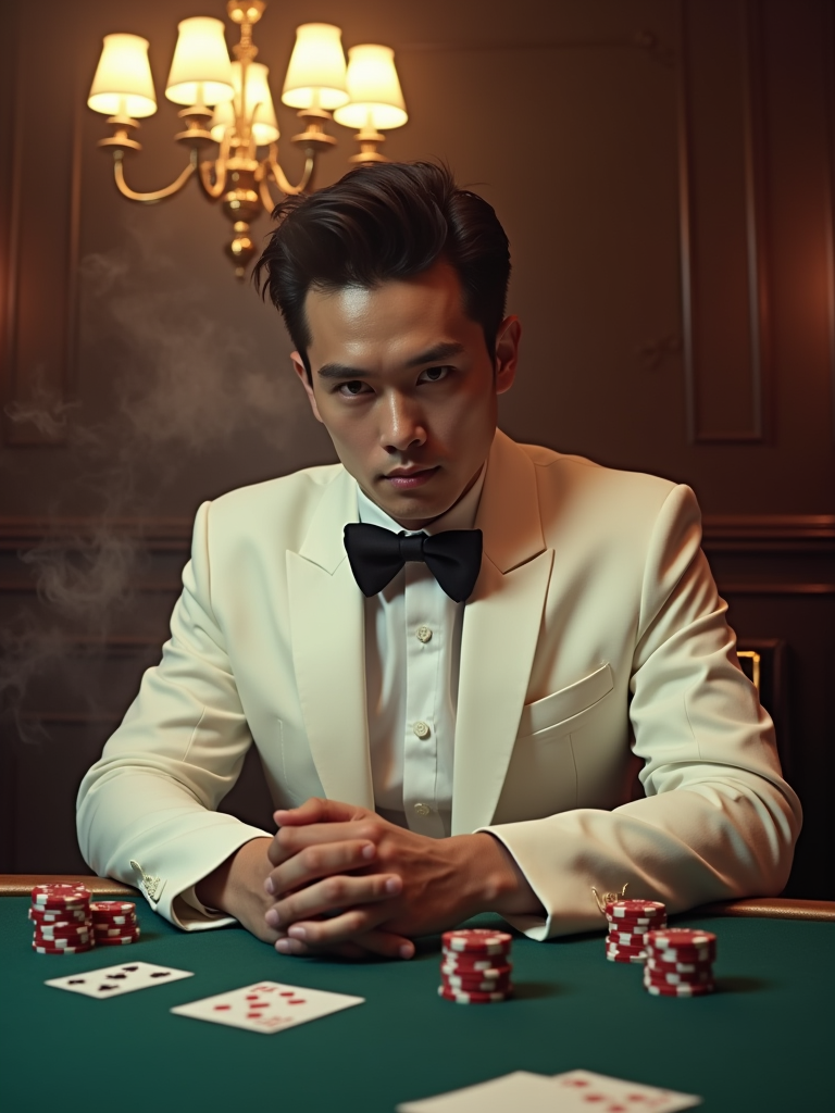 model at a glamorous casino table, wearing a white dinner jacket with black bow tie, surrounded by playing cards and chips, dramatic overhead lighting, cigarette smoke swirling, classic film noir composition