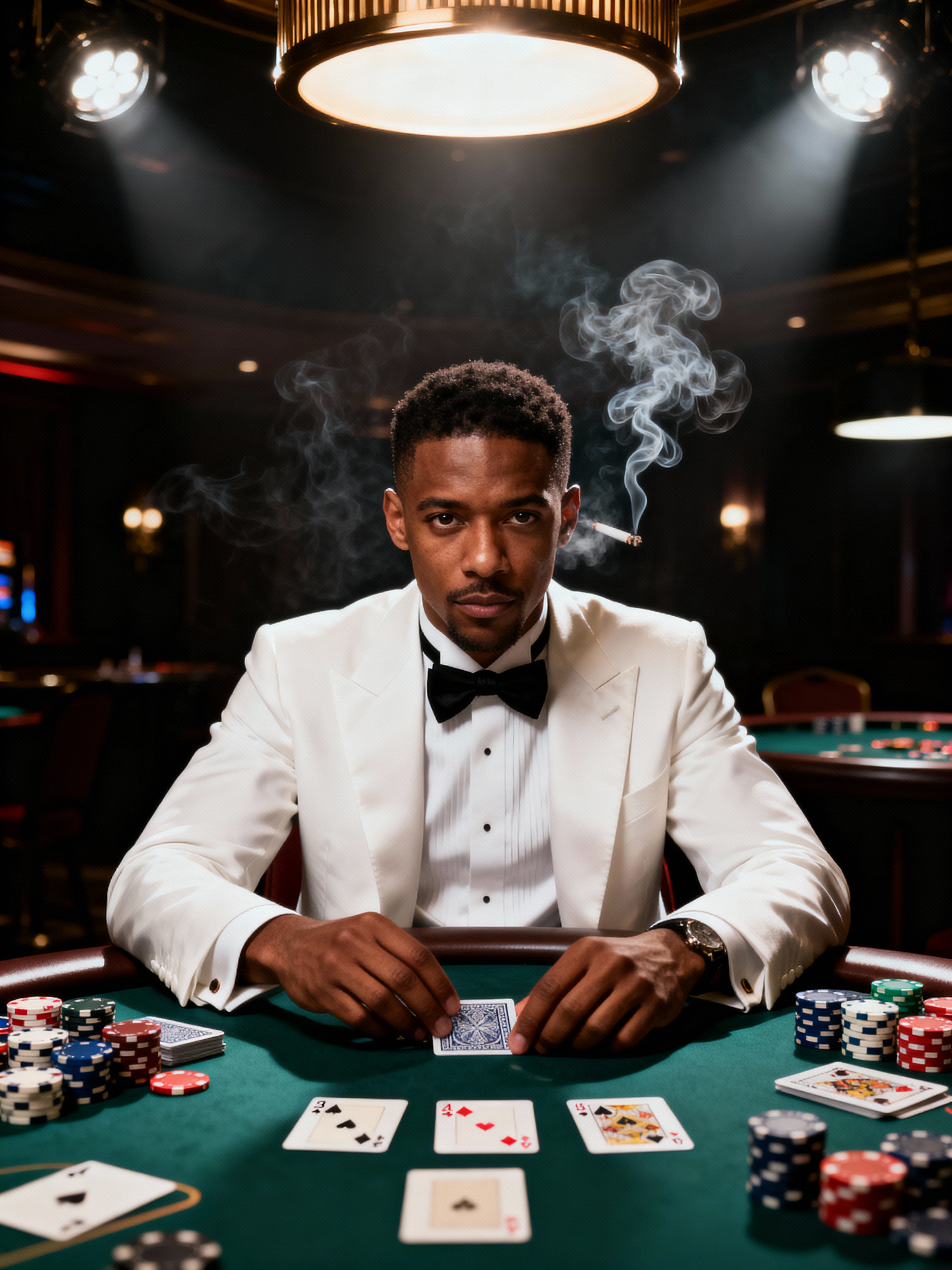 model at a glamorous casino table, wearing a white dinner jacket with black bow tie, surrounded by playing cards and chips, dramatic overhead lighting, cigarette smoke swirling, classic film noir composition