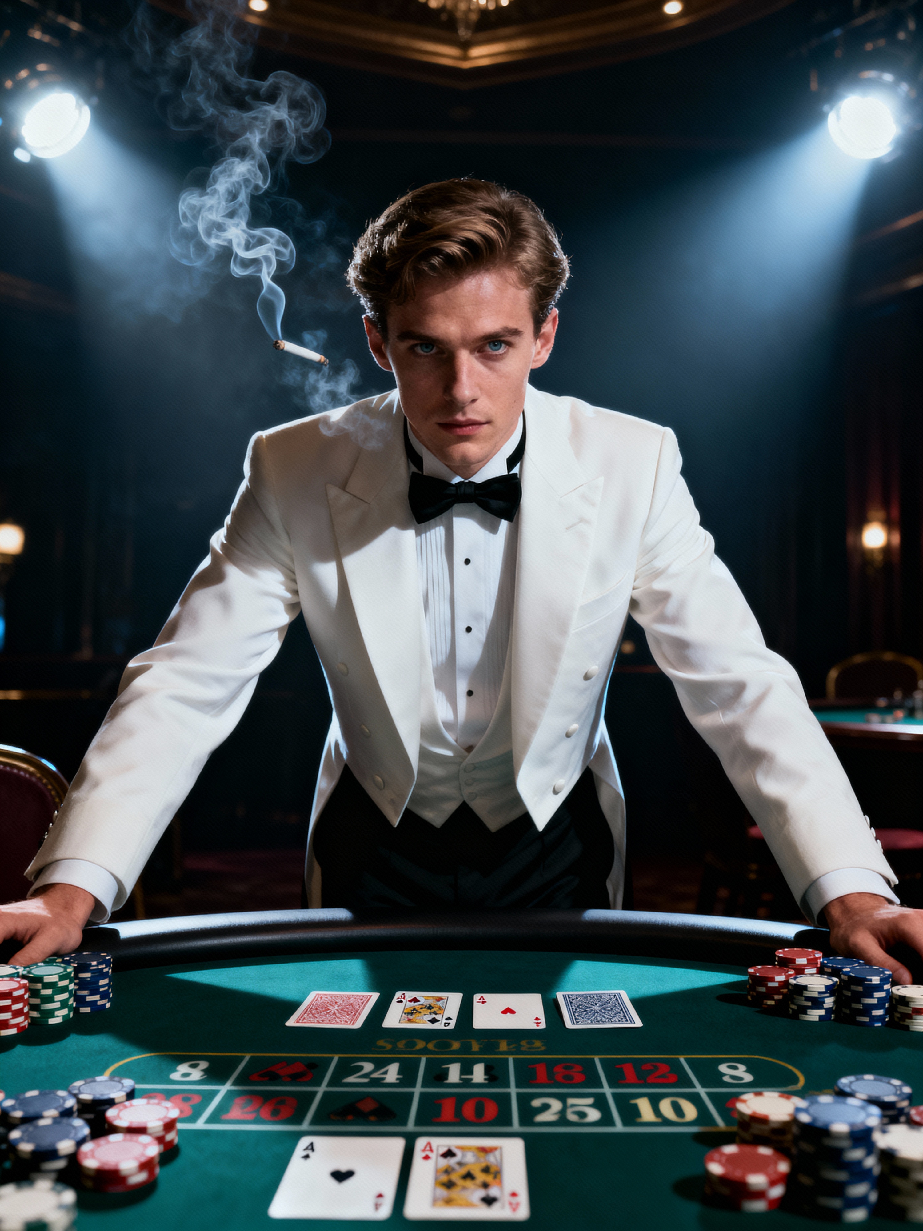 model at a glamorous casino table, wearing a white dinner jacket with black bow tie, surrounded by playing cards and chips, dramatic overhead lighting, cigarette smoke swirling, classic film noir composition