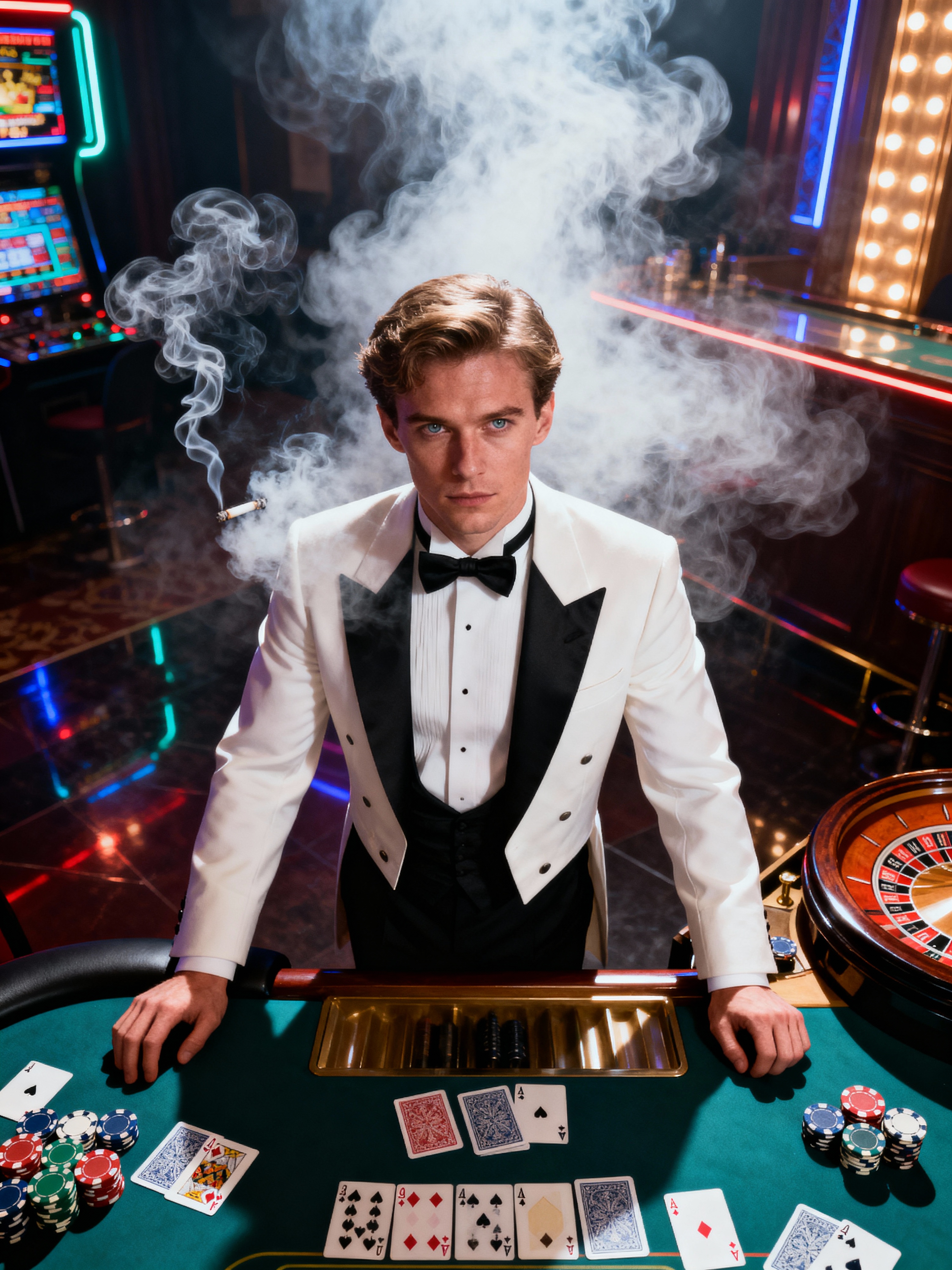 model at a glamorous casino table, wearing a white dinner jacket with black bow tie, surrounded by playing cards and chips, dramatic overhead lighting, cigarette smoke swirling, classic film noir composition