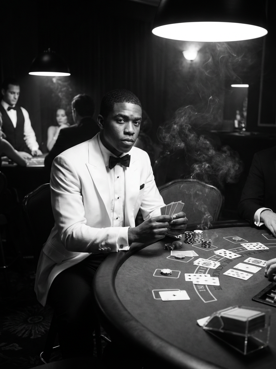 model at a glamorous casino table, wearing a white dinner jacket with black bow tie, surrounded by playing cards and chips, dramatic overhead lighting, cigarette smoke swirling, classic film noir composition