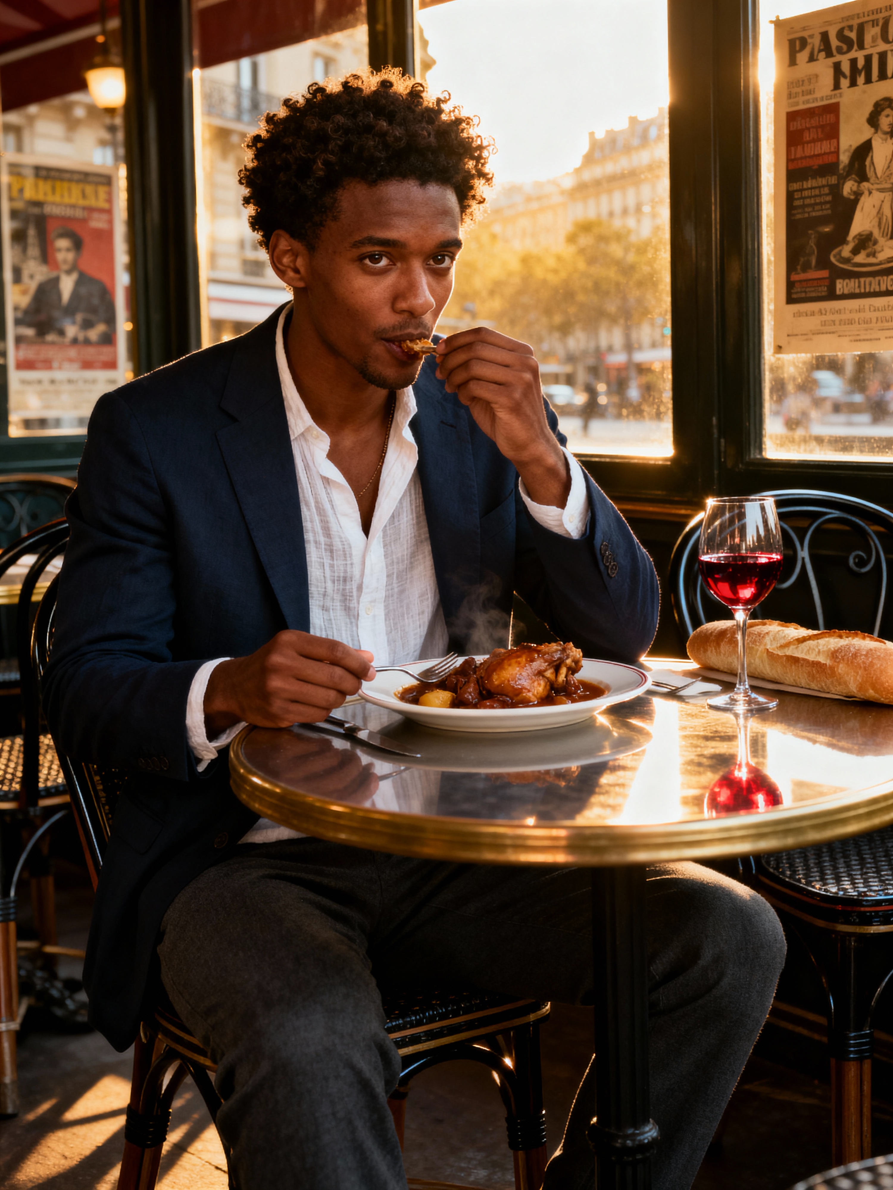 model at a Parisian bistro, wearing relaxed business casual outfit, enjoying French cuisine
