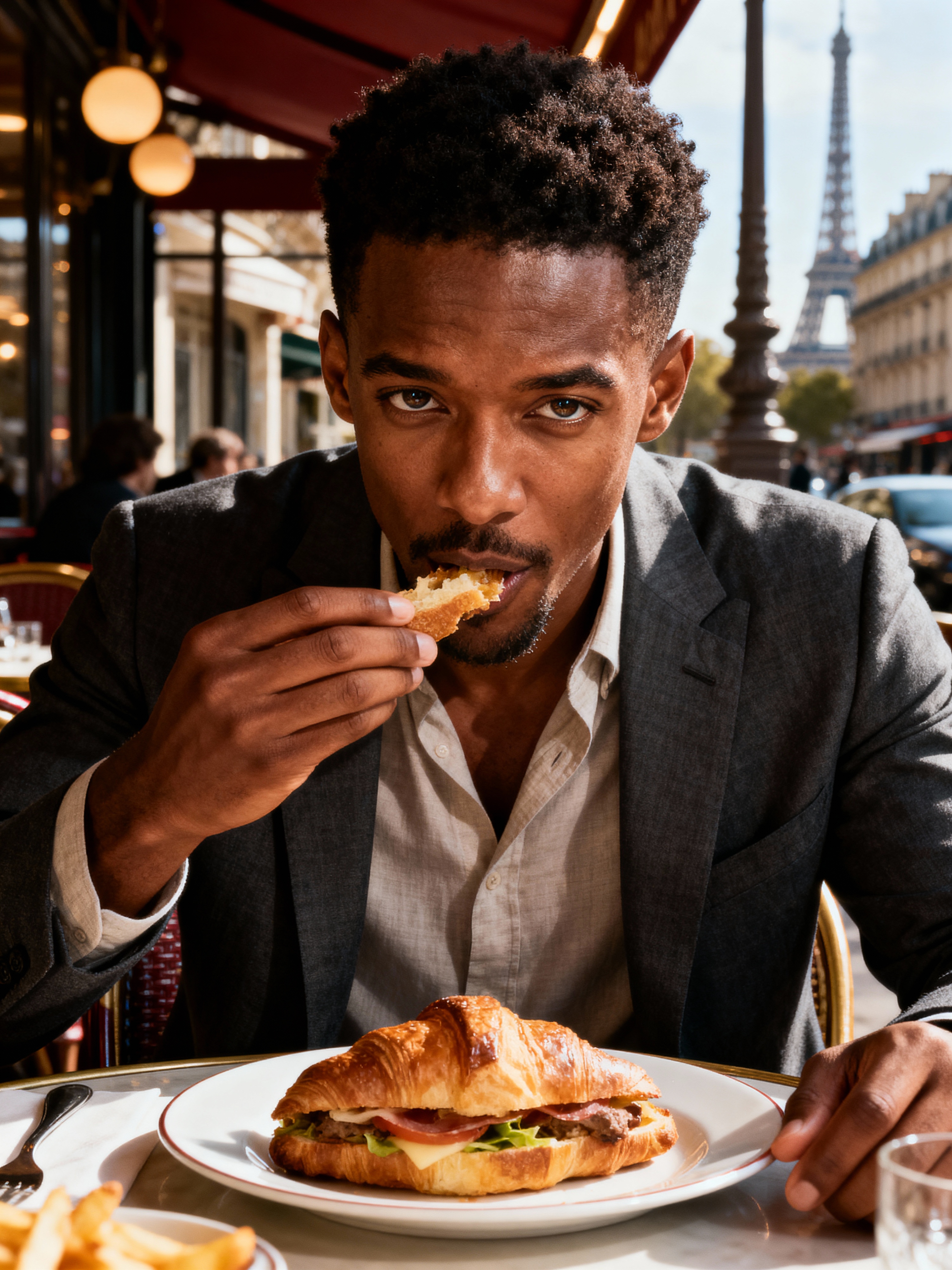 model at a Parisian bistro, wearing relaxed business casual outfit, enjoying French cuisine