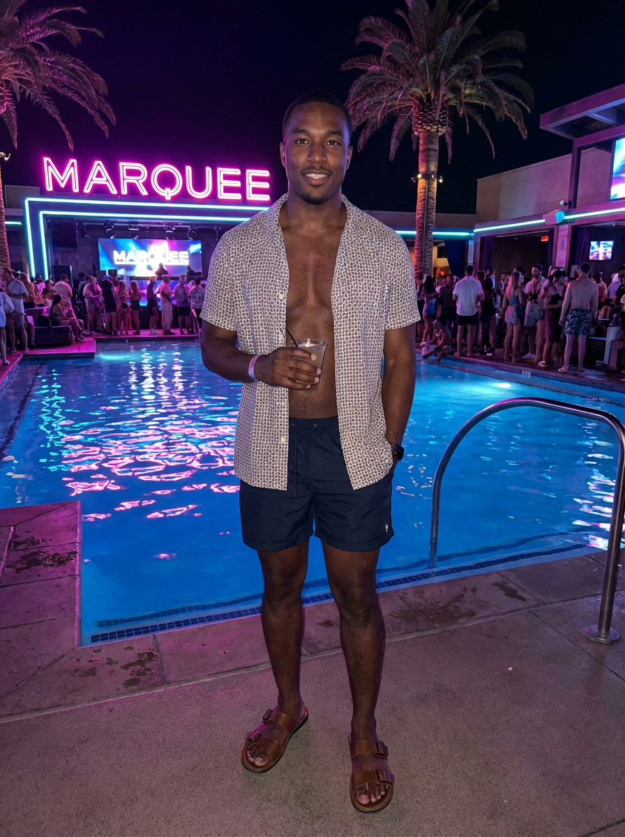 model at a pool party in Las Vegas at night with neon lights saying "Marquee". the model wears swim trunks with a casual button-up shirt and stylish sandals
