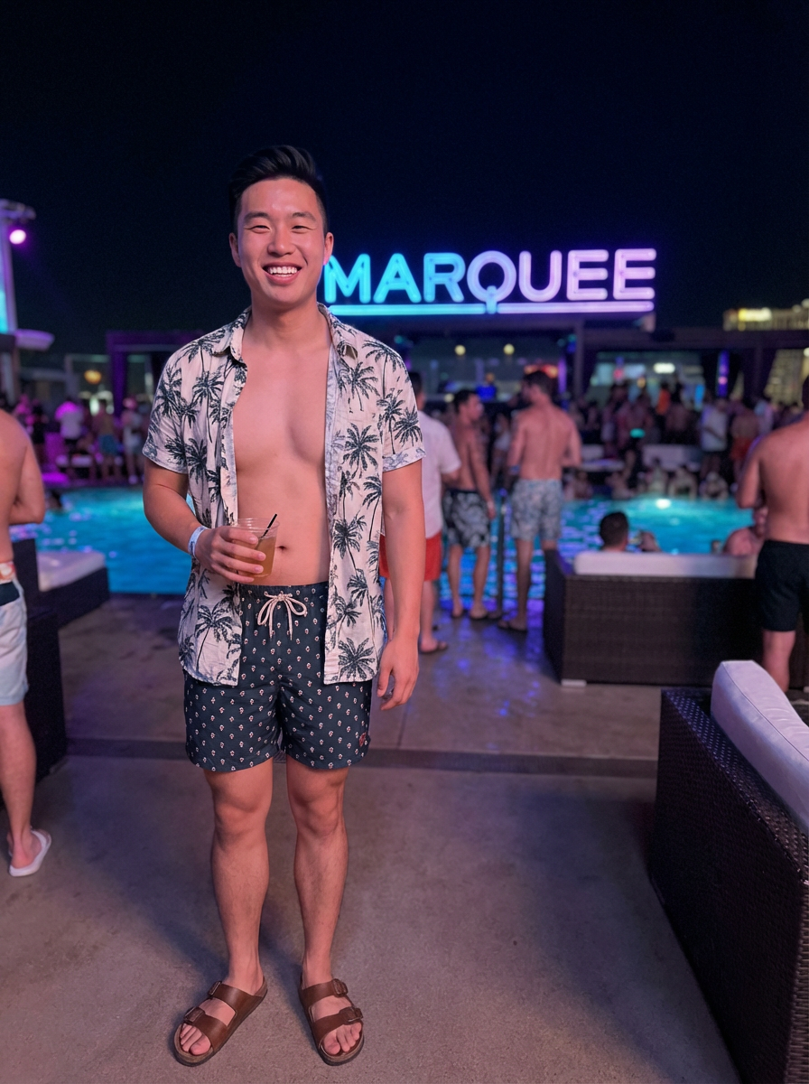 model at a pool party in Las Vegas at night with neon lights saying "Marquee". the model wears swim trunks with a casual button-up shirt and stylish sandals