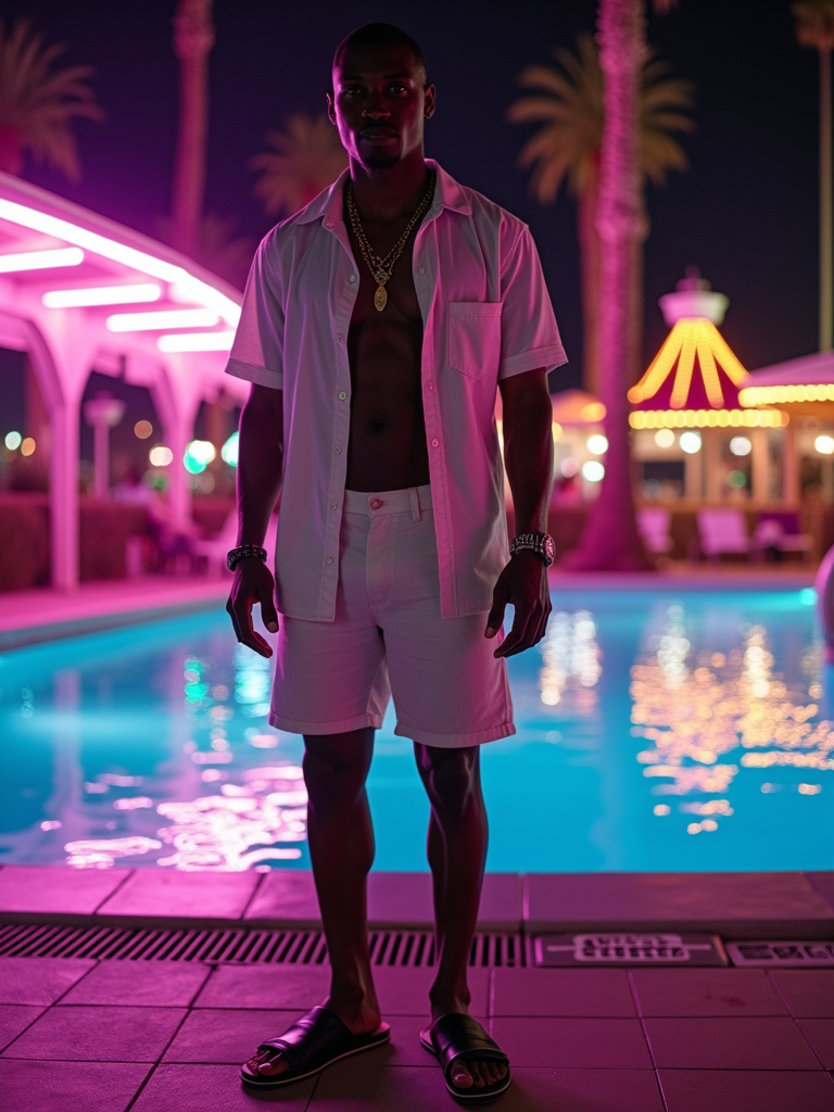 model at a pool party in Las Vegas at night with neon lights. the model sports a trendy poolside outfit, such as swim trunks with a casual button-up shirt and stylish sandals, embodying the lively and energetic atmosphere of the event.