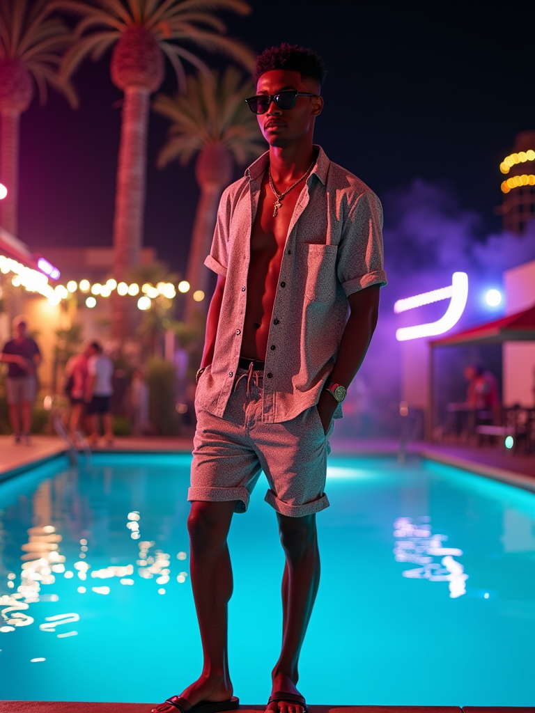 model at a pool party in Las Vegas at night with neon lights. the model sports a trendy poolside outfit, such as swim trunks with a casual button-up shirt and stylish sandals, embodying the lively and energetic atmosphere of the event.