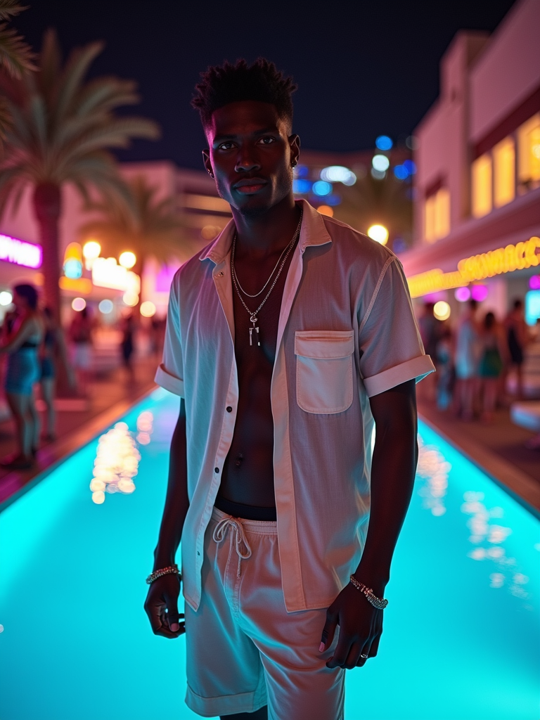 model at a pool party in Las Vegas at night with neon lights. the model sports a trendy poolside outfit, such as swim trunks with a casual button-up shirt and stylish sandals, embodying the lively and energetic atmosphere of the event.