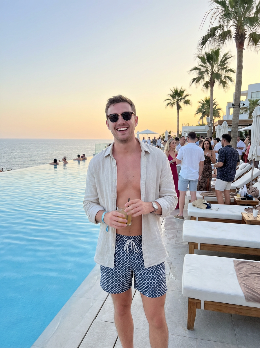 model at a poolside party in a luxury hotel, wearing white swim shorts with an shirt, infinity pool with ocean view