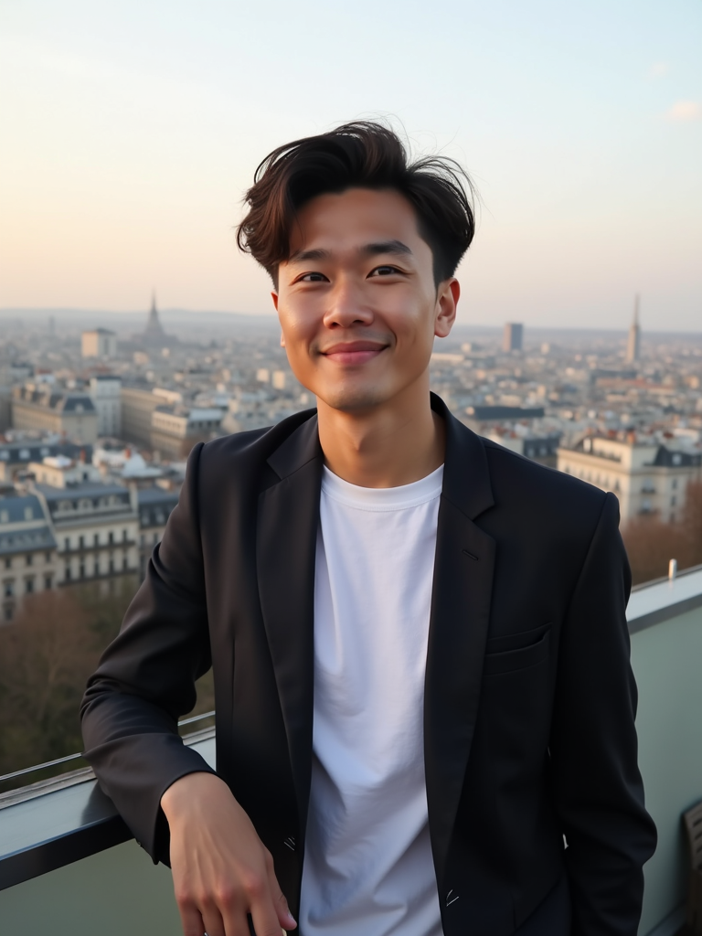 model at a rooftop bar in Montmartre, wearing a smart casual blazer with t-shirt, Paris skyline in background