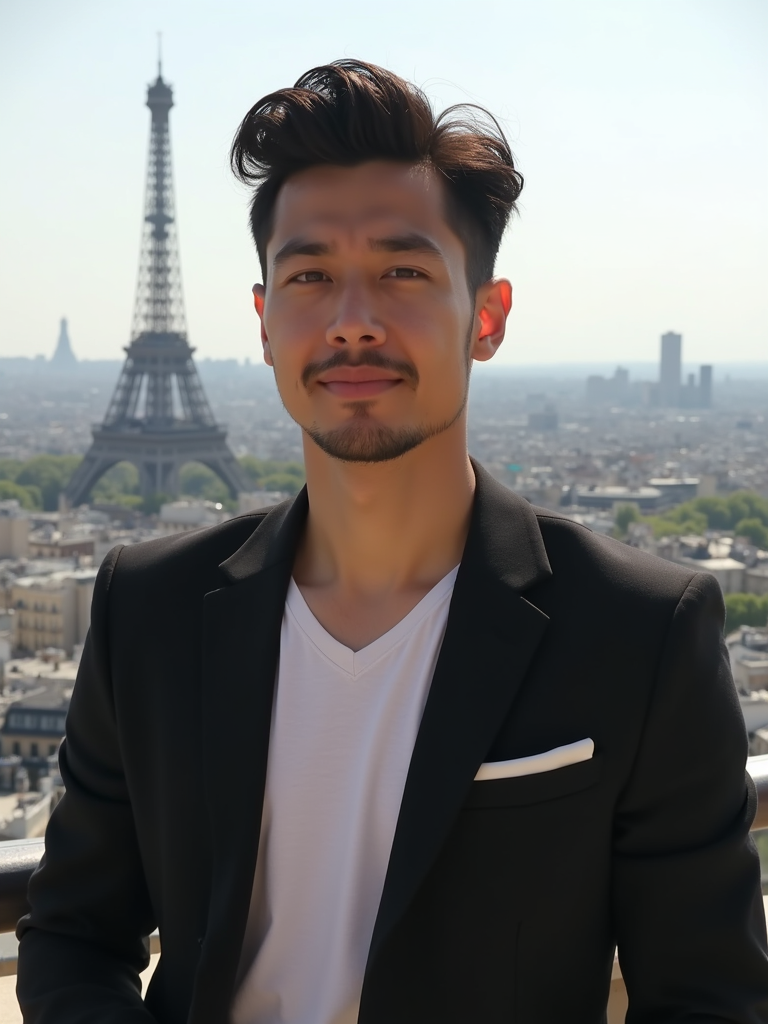 model at a rooftop bar in Montmartre, wearing a smart casual blazer with t-shirt, Paris skyline in background
