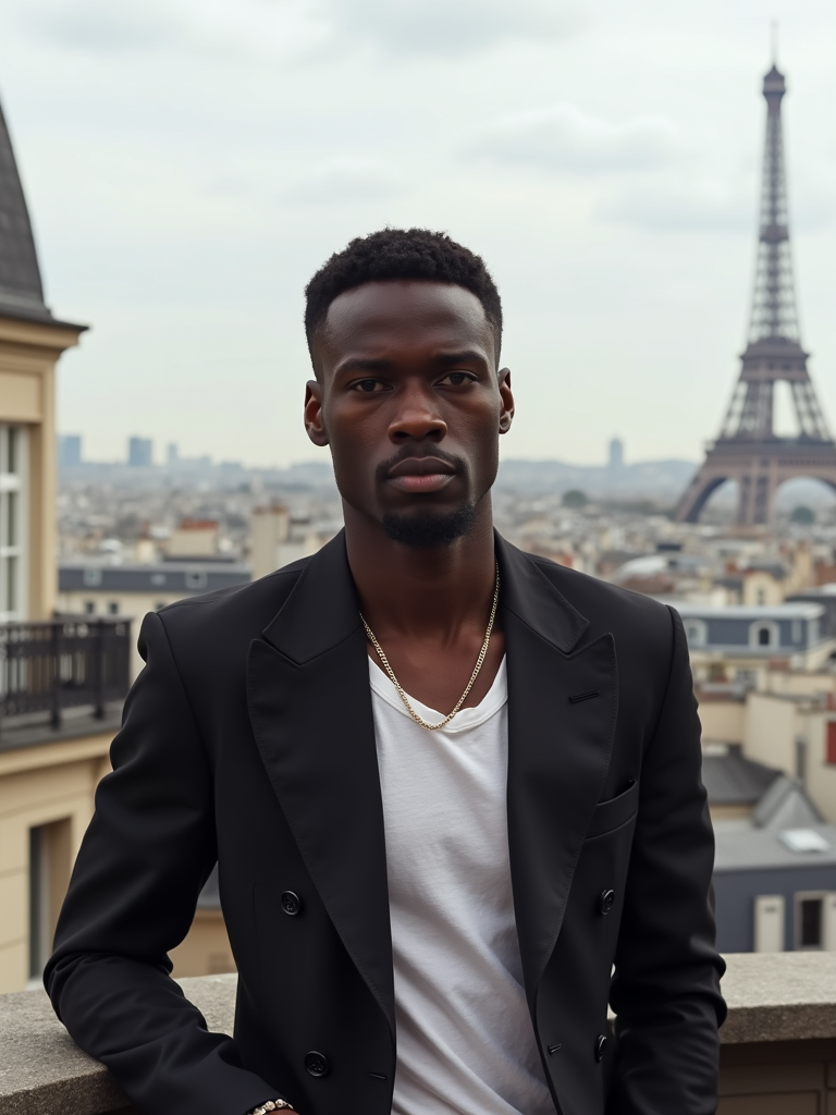 model at a rooftop bar in Montmartre, wearing a smart casual blazer with t-shirt, Paris skyline in background