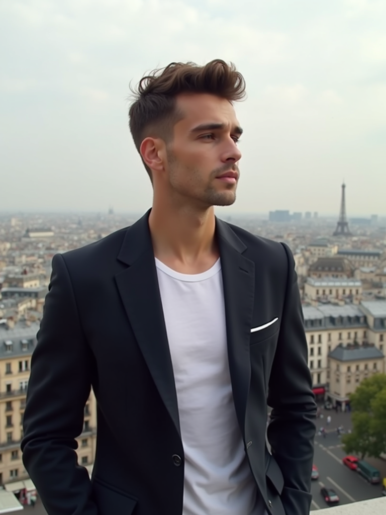 model at a rooftop bar in Montmartre, wearing a smart casual blazer with t-shirt, Paris skyline in background