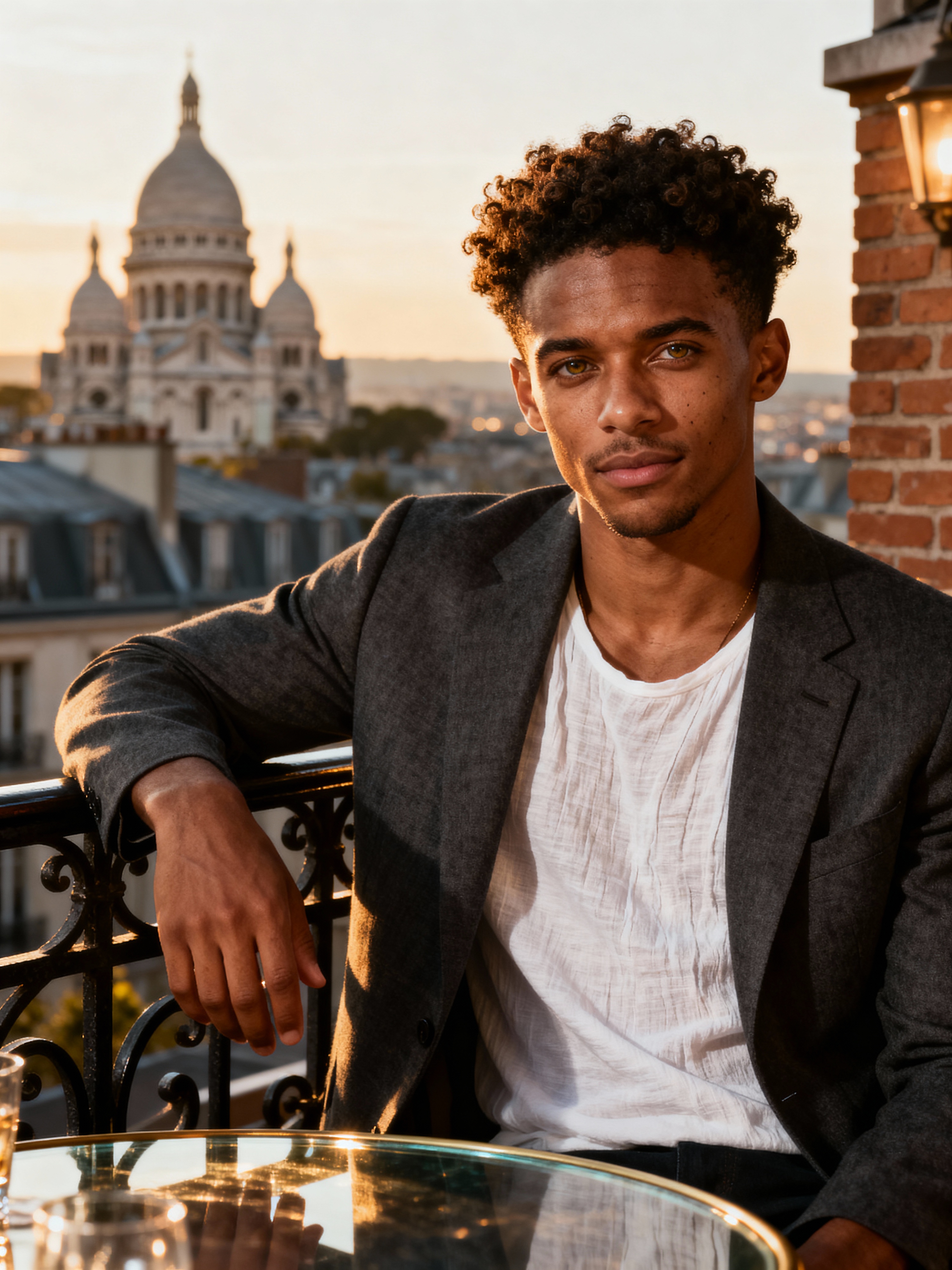 model at a rooftop bar in Montmartre, wearing a smart casual blazer with t-shirt, Paris skyline in background