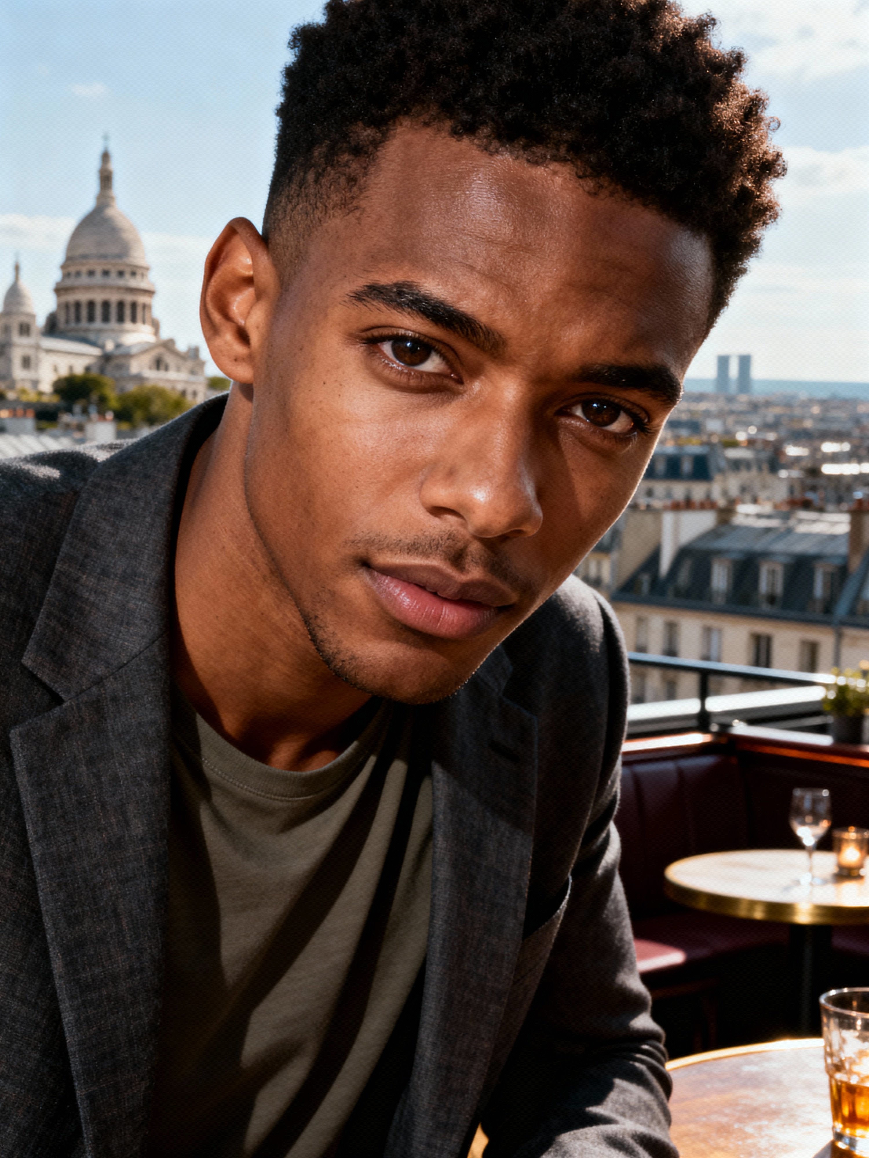 model at a rooftop bar in Montmartre, wearing a smart casual blazer with t-shirt, Paris skyline in background