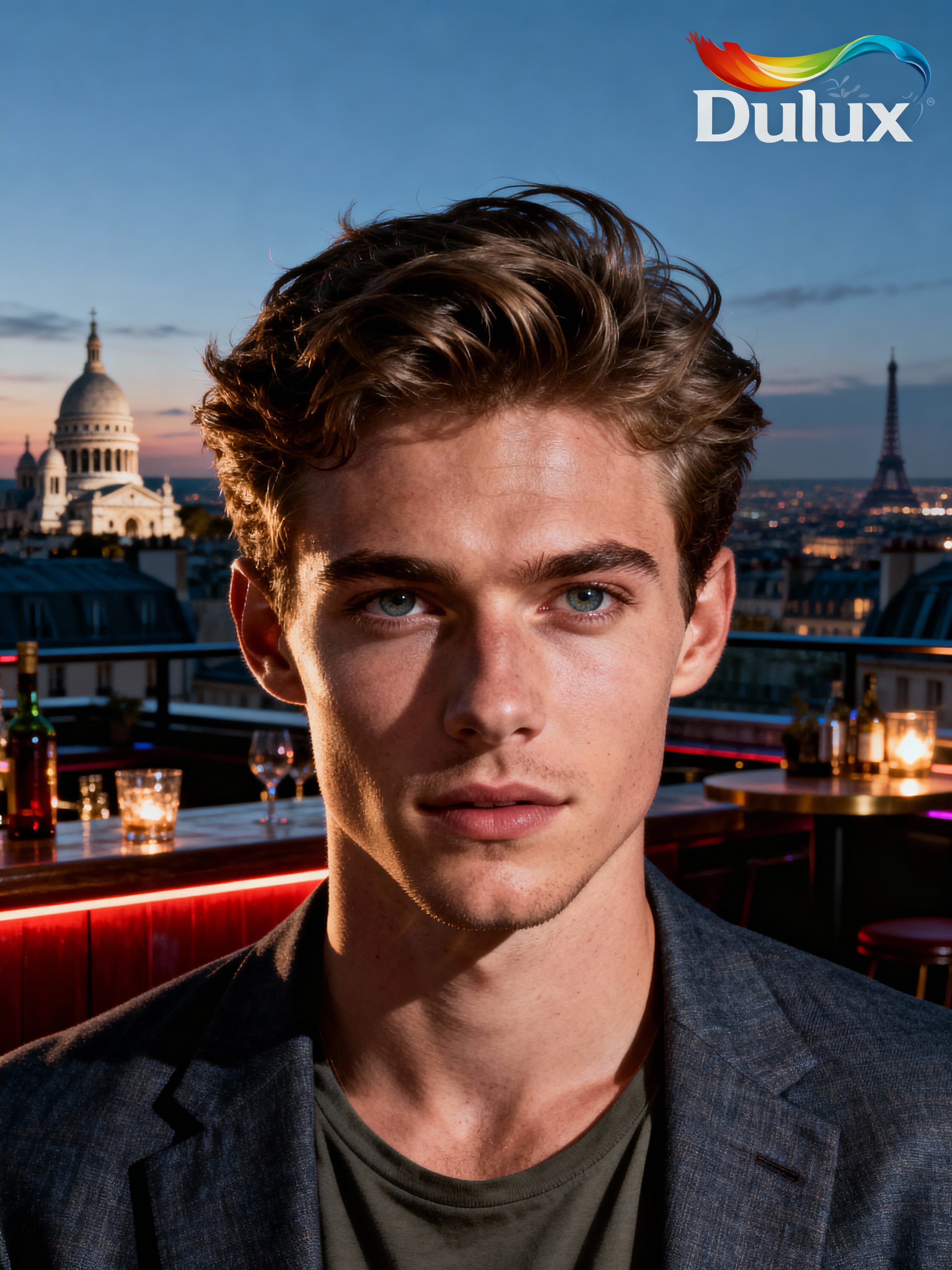 model at a rooftop bar in Montmartre, wearing a smart casual blazer with t-shirt, Paris skyline in background
