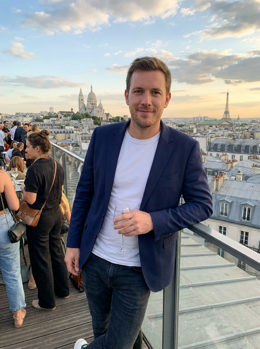 model at a rooftop bar in Montmartre, wearing a smart casual blazer with t-shirt, Paris skyline in background
