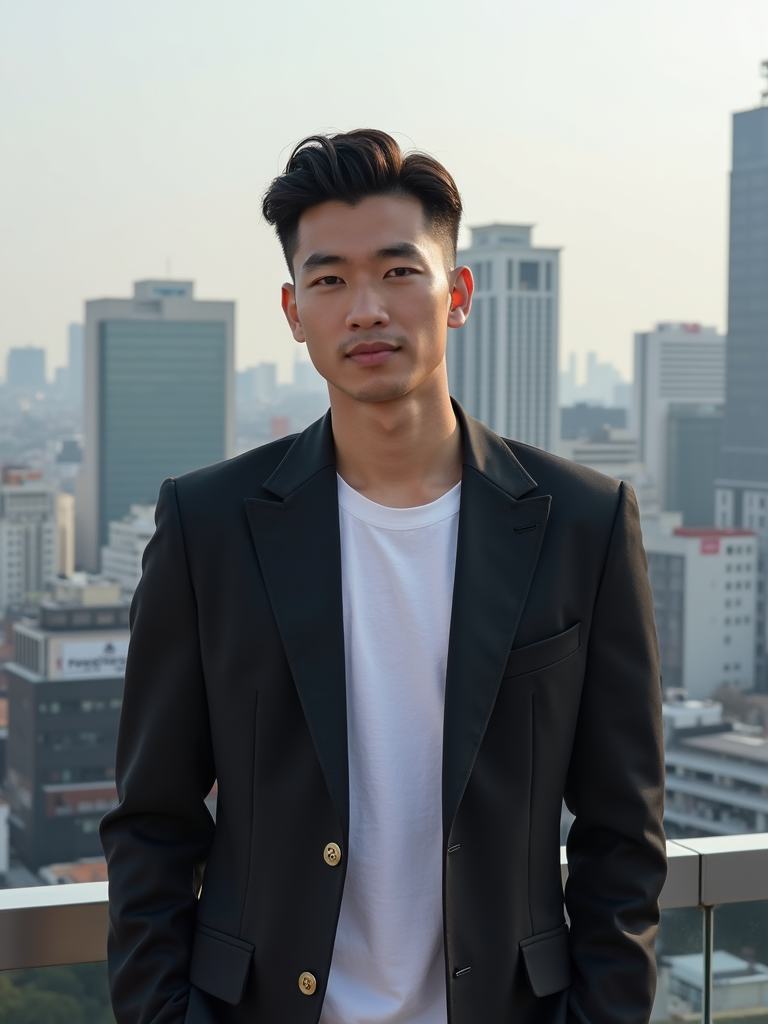 model at a rooftop bar in Shinjuku, wearing a smart casual blazer with t-shirt, Tokyo skyline in background