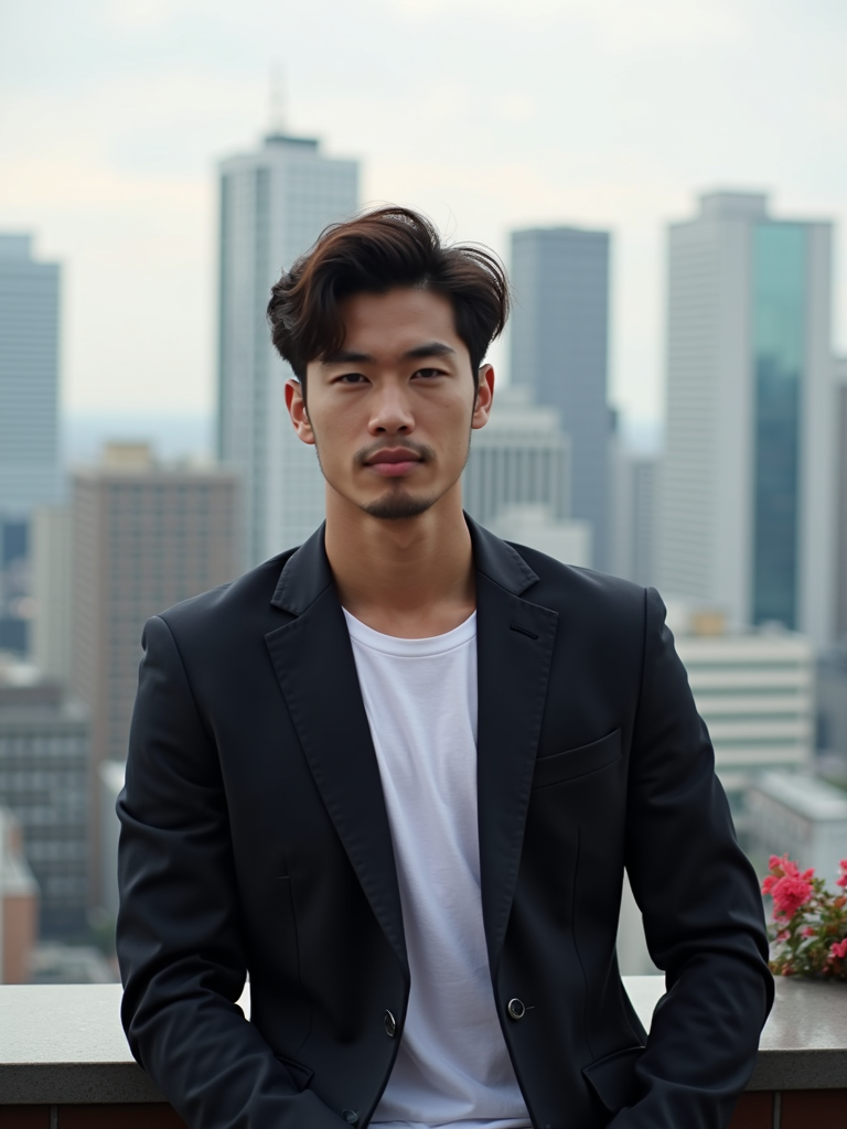 model at a rooftop bar in Shinjuku, wearing a smart casual blazer with t-shirt, Tokyo skyline in background