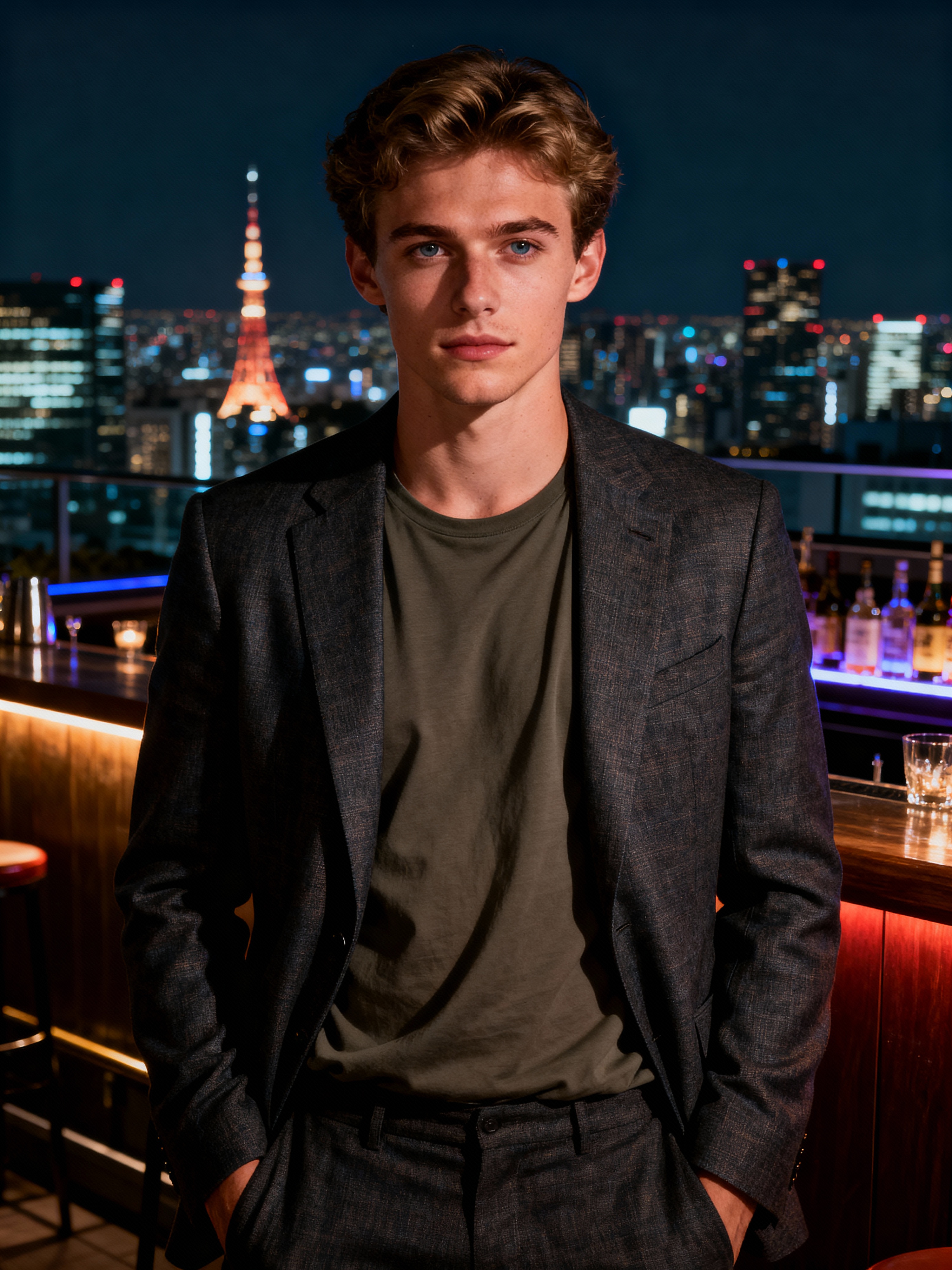 model at a rooftop bar in Shinjuku, wearing a smart casual blazer with t-shirt, Tokyo skyline in background