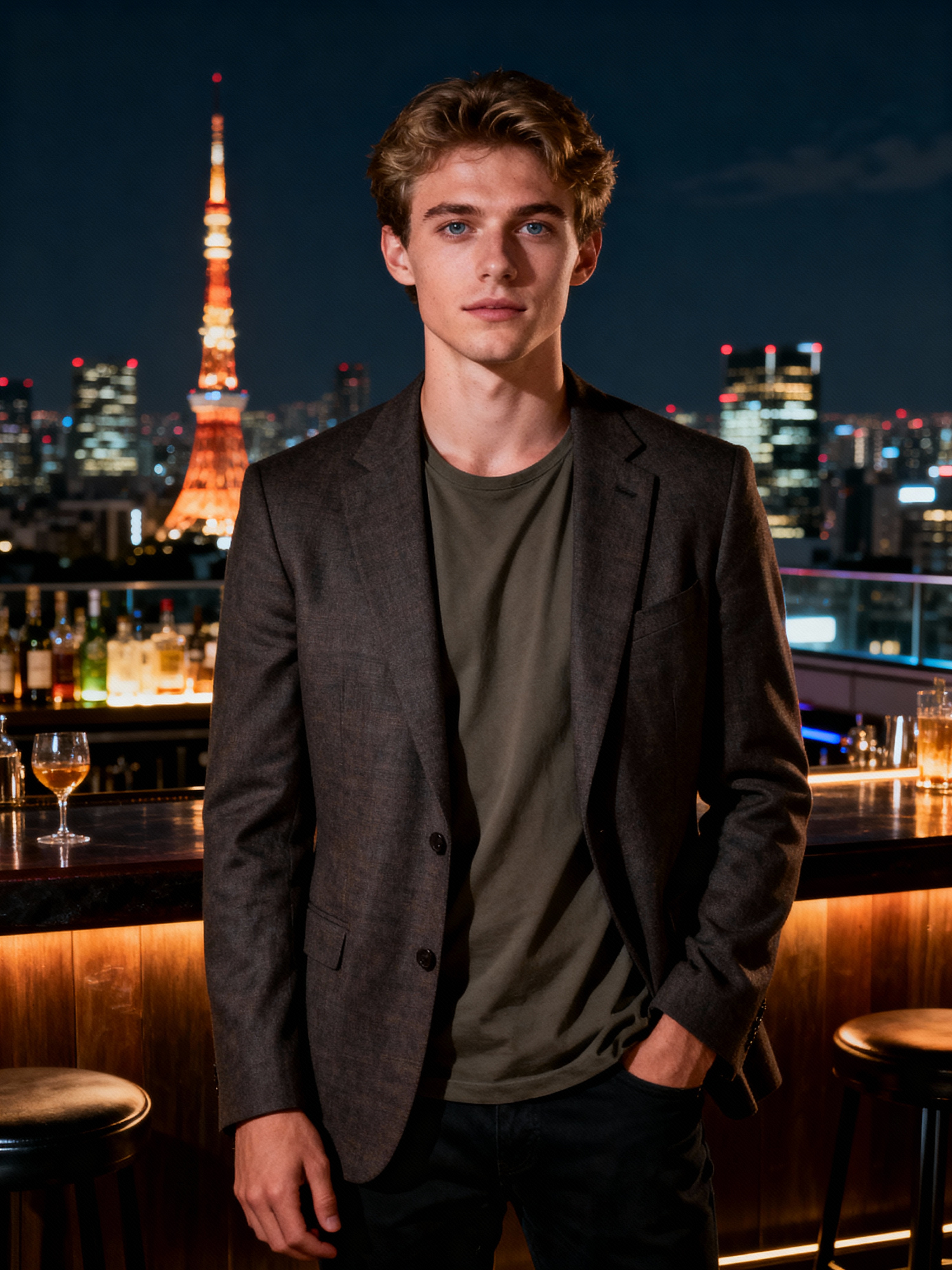 model at a rooftop bar in Shinjuku, wearing a smart casual blazer with t-shirt, Tokyo skyline in background