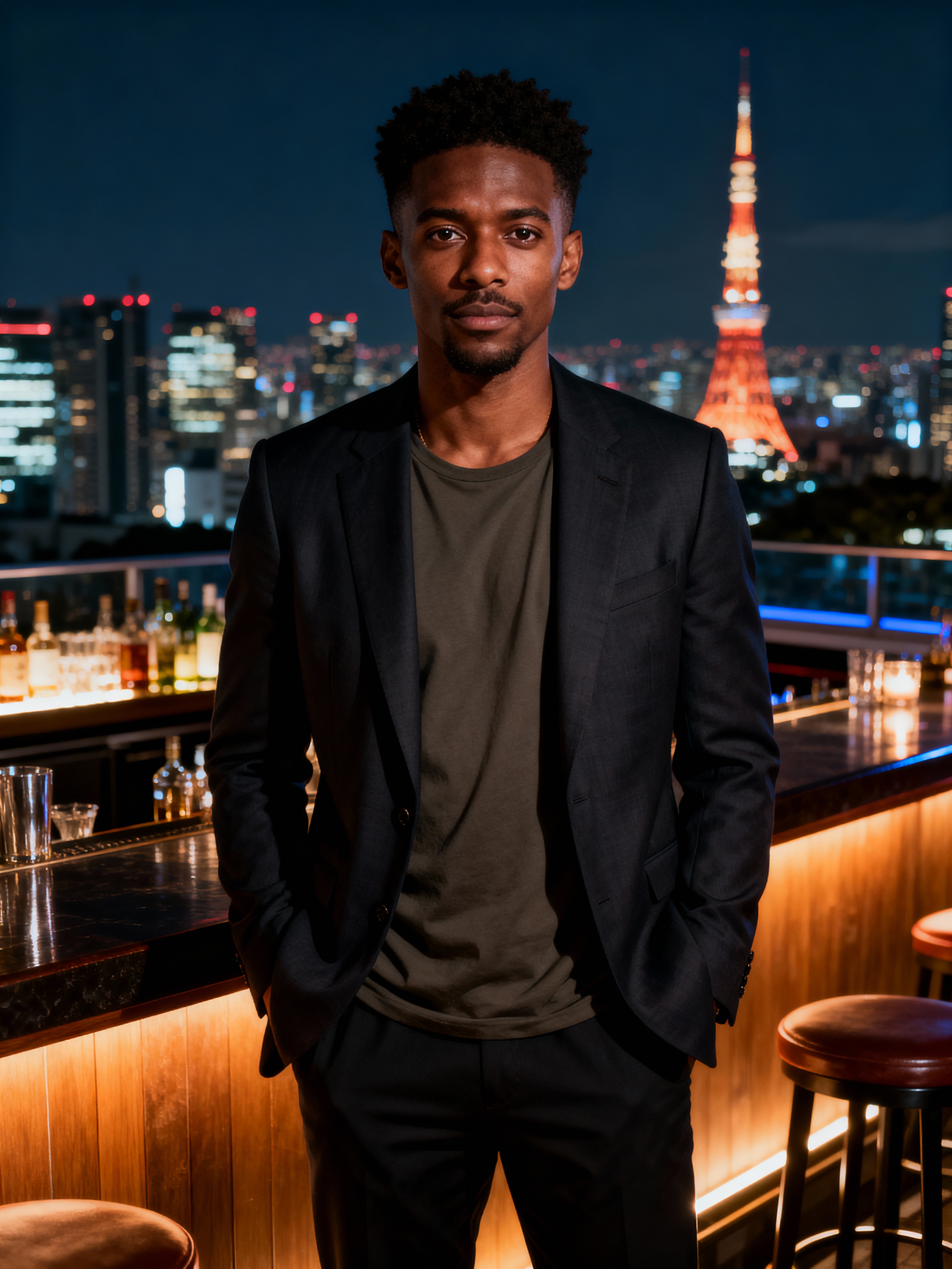 model at a rooftop bar in Shinjuku, wearing a smart casual blazer with t-shirt, Tokyo skyline in background