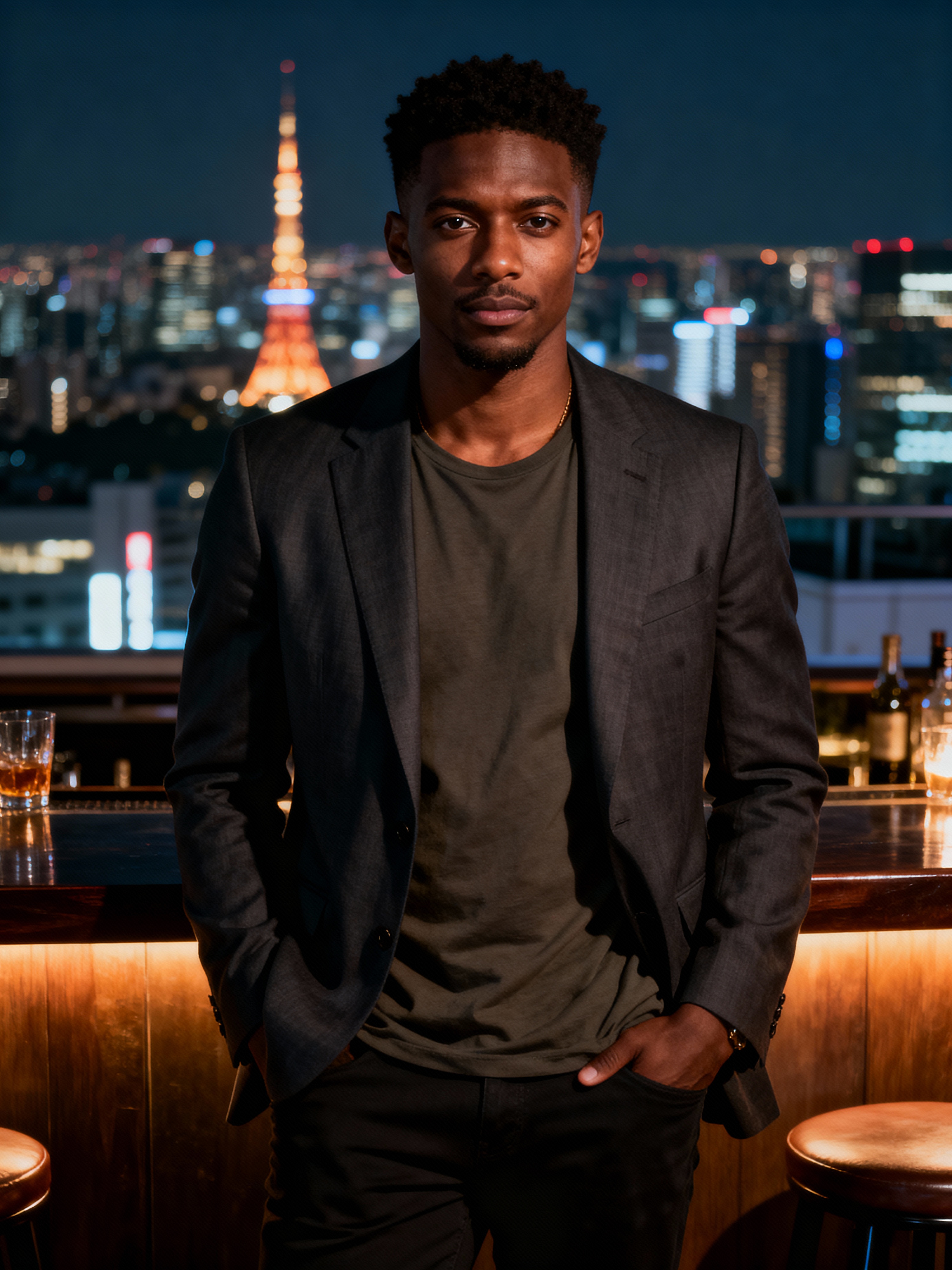 model at a rooftop bar in Shinjuku, wearing a smart casual blazer with t-shirt, Tokyo skyline in background