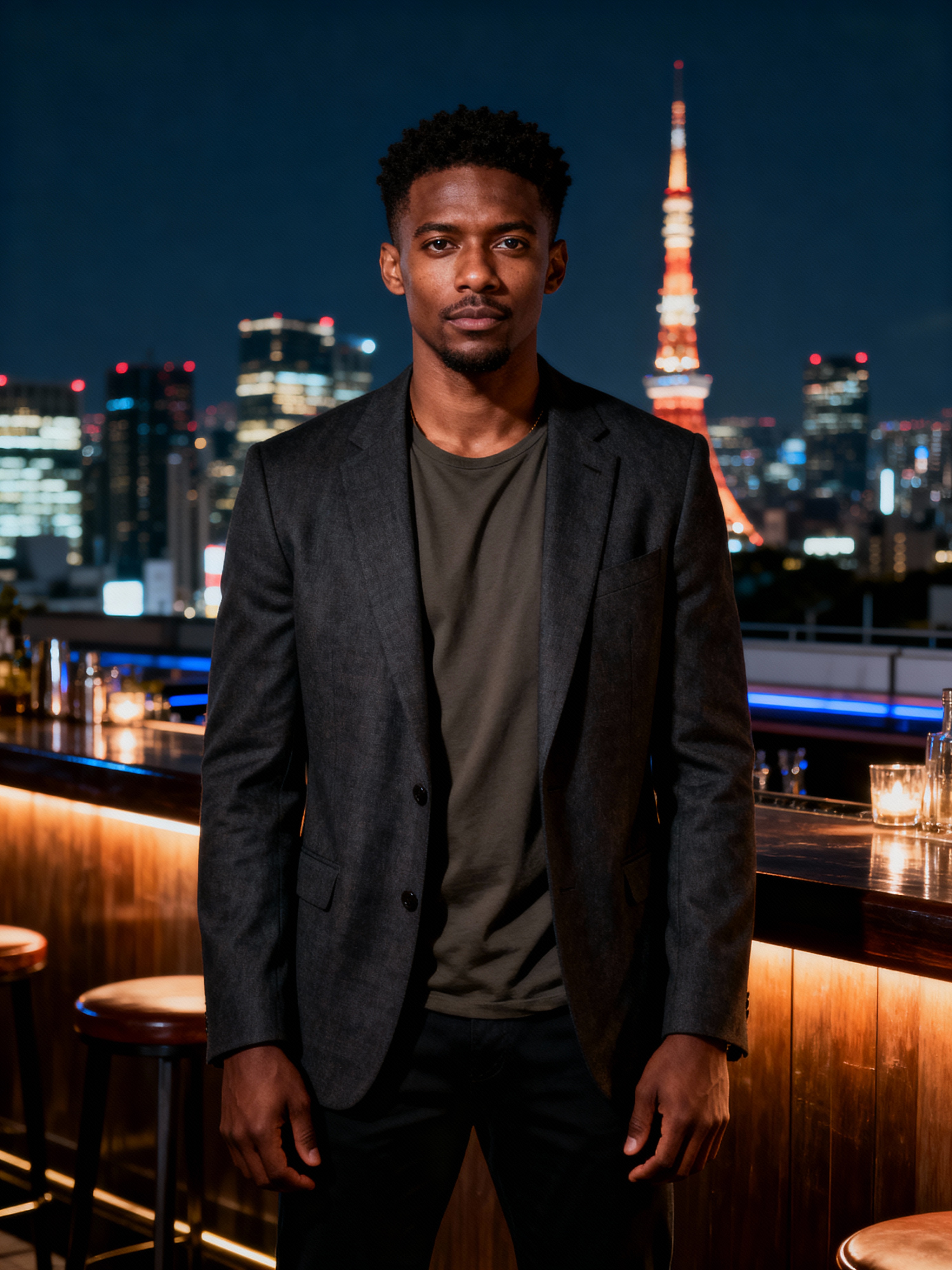 model at a rooftop bar in Shinjuku, wearing a smart casual blazer with t-shirt, Tokyo skyline in background