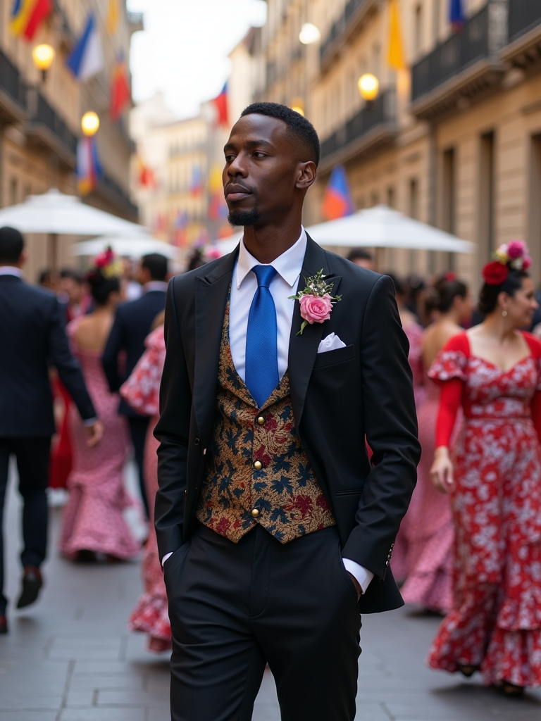 model at a Spanish flamenco festival, wearing a smart outfit with European blue tie, surrounded by dancers and musicians, historic plaza decorated with European flags and flowers