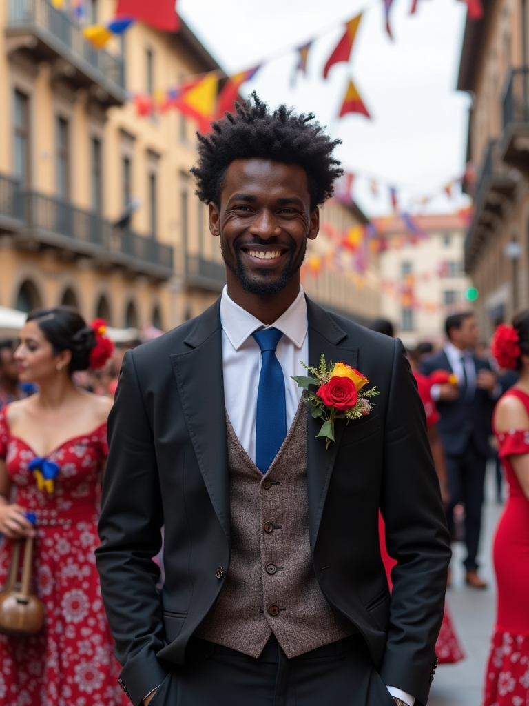 model at a Spanish flamenco festival, wearing a smart outfit with European blue tie, surrounded by dancers and musicians, historic plaza decorated with European flags and flowers