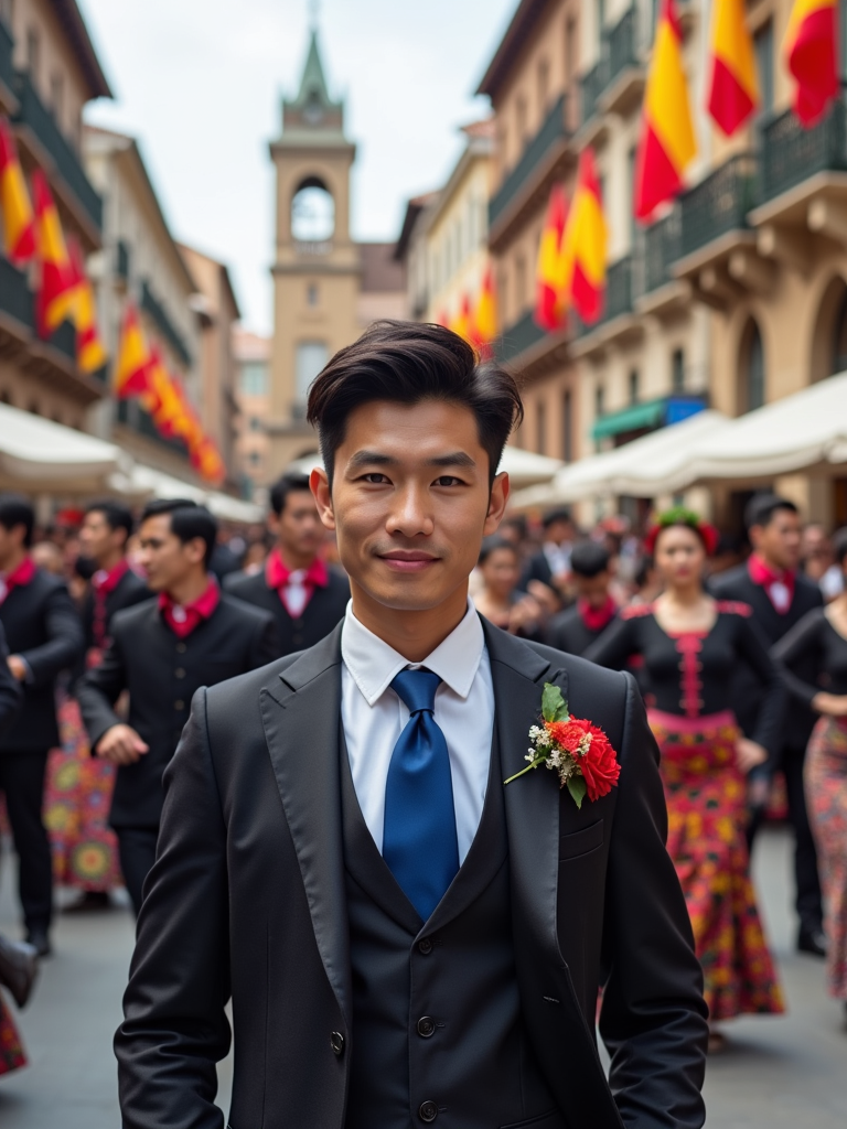 model at a Spanish flamenco festival, wearing a smart outfit with European blue tie, surrounded by dancers and musicians, historic plaza decorated with European flags and flowers