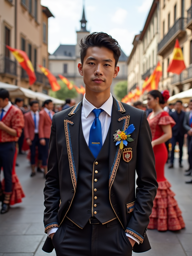 model at a Spanish flamenco festival, wearing a smart outfit with European blue tie, surrounded by dancers and musicians, historic plaza decorated with European flags and flowers