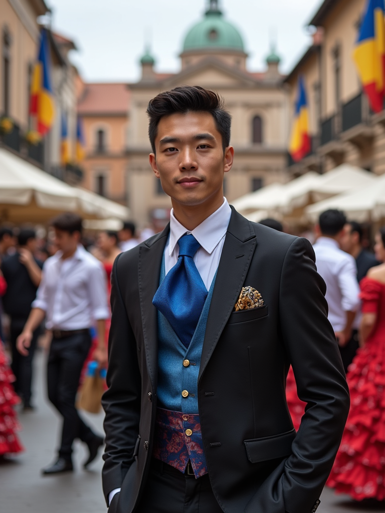 model at a Spanish flamenco festival, wearing a smart outfit with European blue tie, surrounded by dancers and musicians, historic plaza decorated with European flags and flowers