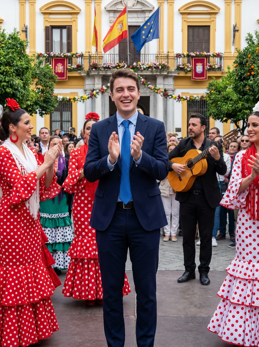 model at a Spanish flamenco festival, wearing a smart outfit with European blue tie, surrounded by dancers and musicians, historic plaza decorated with European flags and flowers