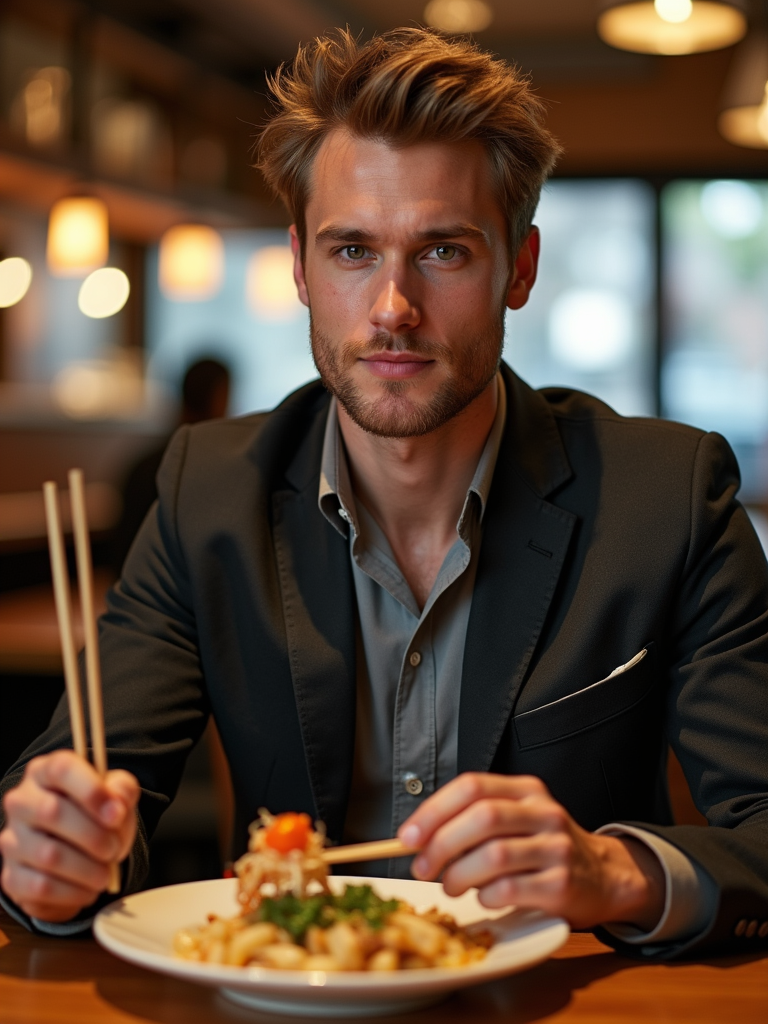 model at a Tokyo izakaya restaurant, wearing relaxed business casual outfit, enjoying Japanese cuisine