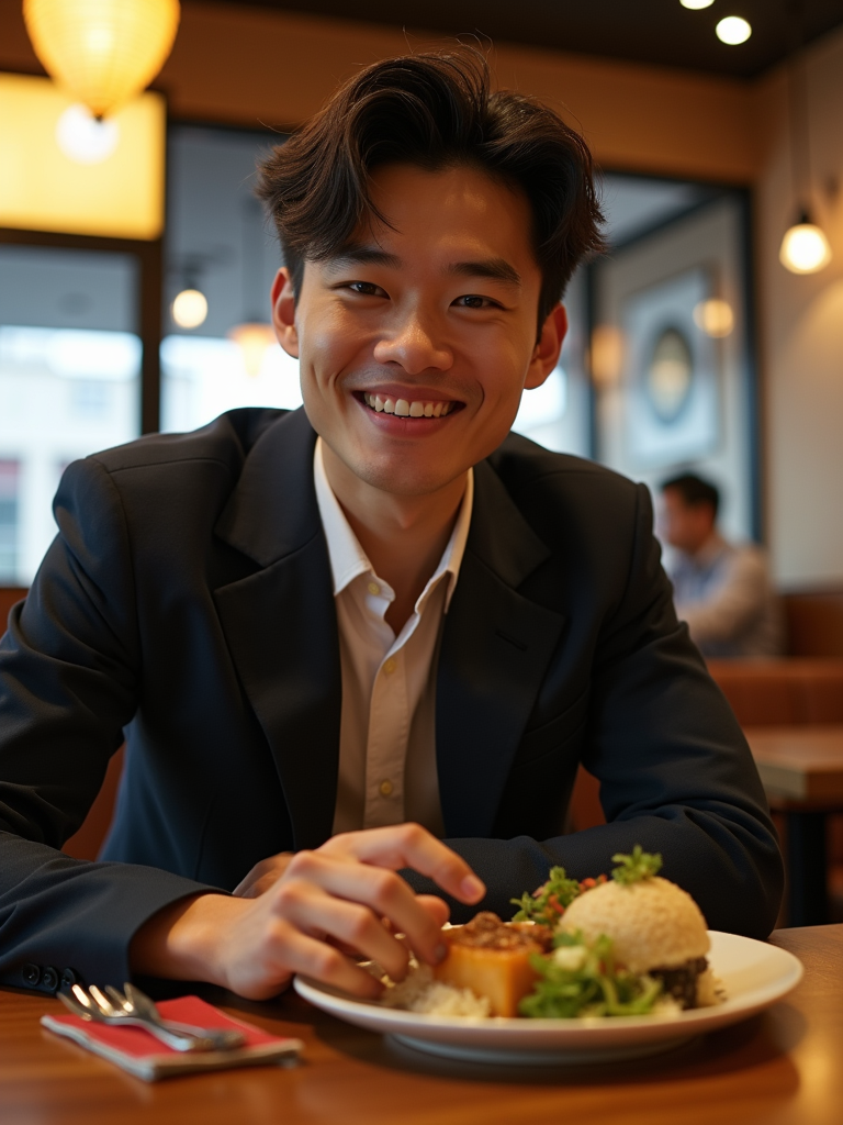 model at a Tokyo izakaya restaurant, wearing relaxed business casual outfit, enjoying Japanese cuisine