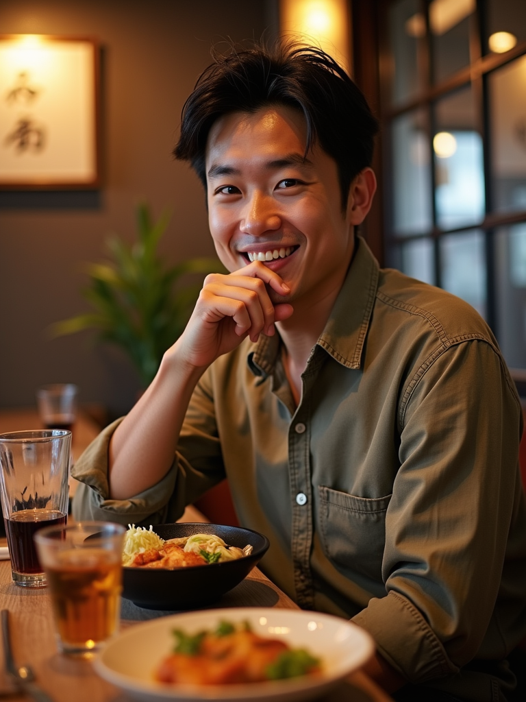model at a Tokyo izakaya restaurant, wearing relaxed business casual outfit, enjoying Japanese cuisine