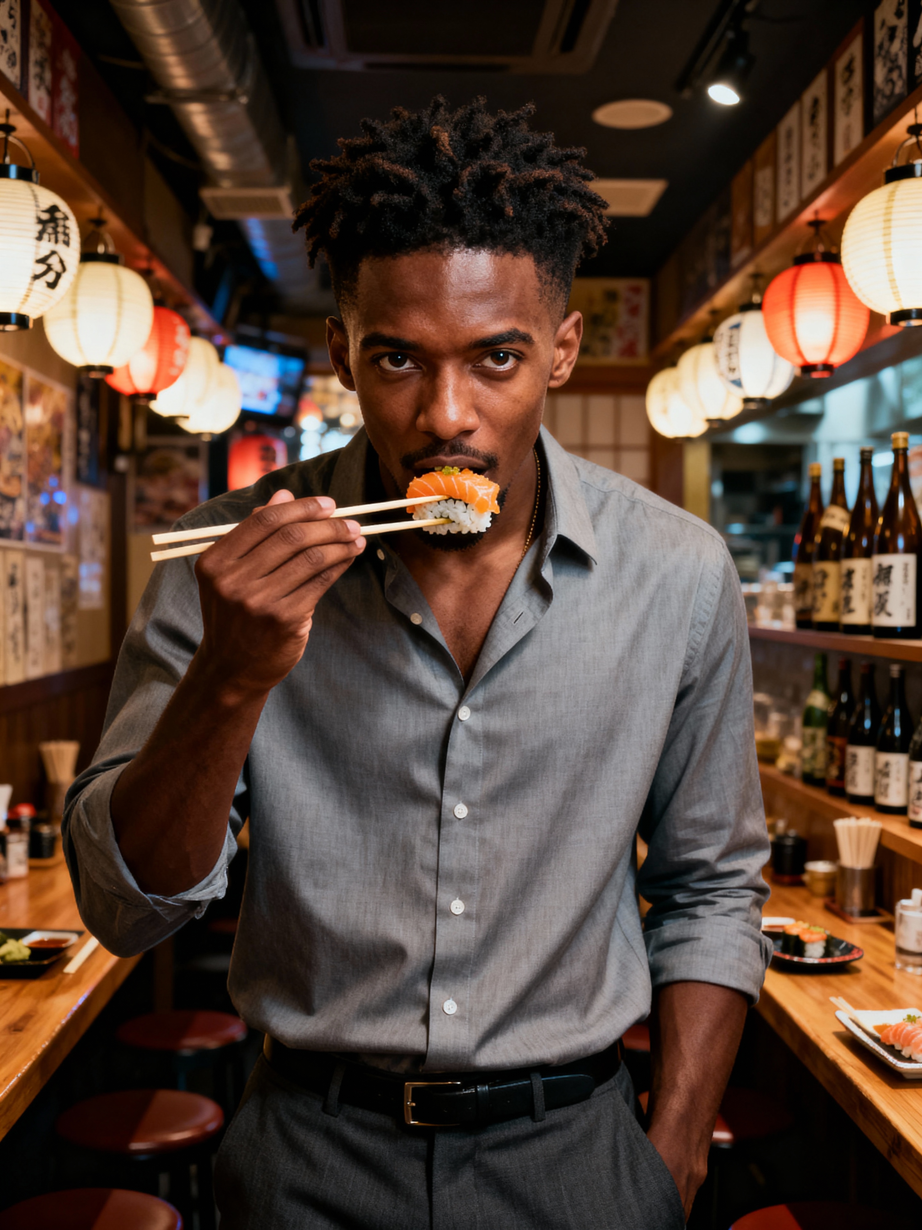 model at a Tokyo izakaya restaurant, wearing relaxed business casual outfit, enjoying Japanese cuisine