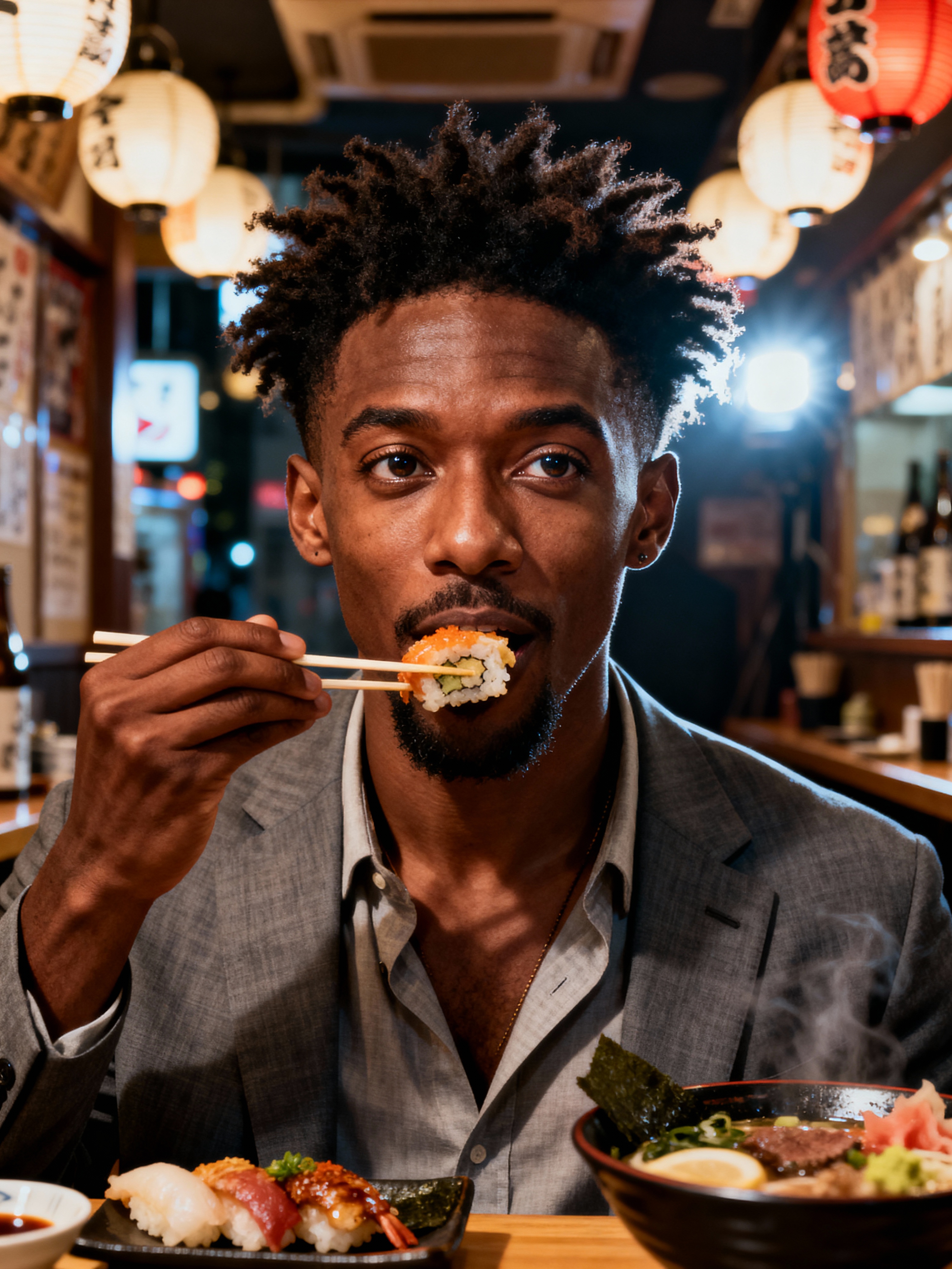model at a Tokyo izakaya restaurant, wearing relaxed business casual outfit, enjoying Japanese cuisine